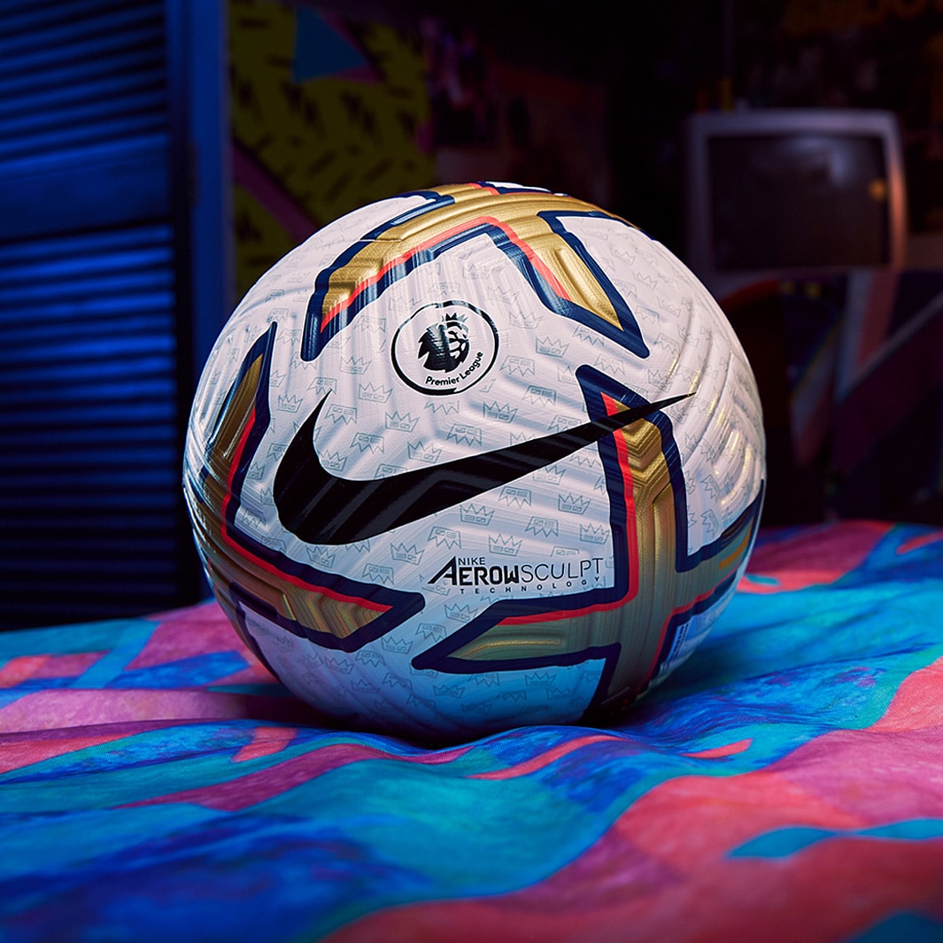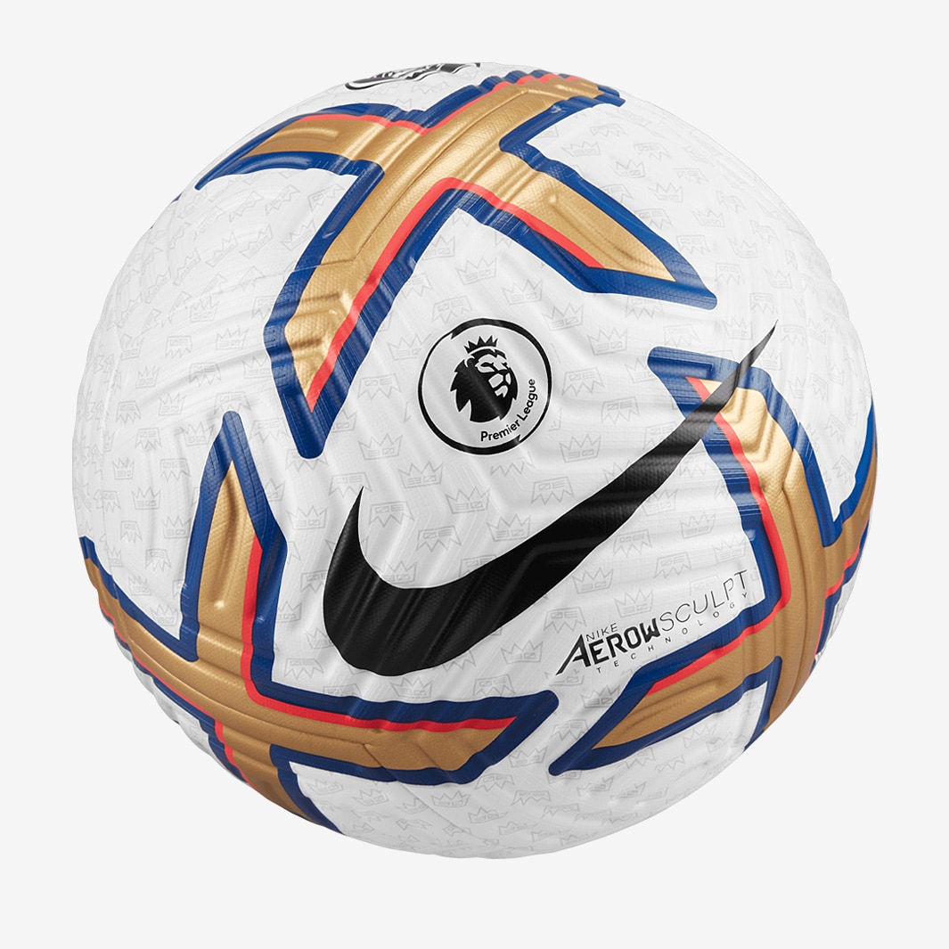 This is the Nike Premier League Flight football in White/Gold/Blue/Black, which maintains a 30% truer flight for precision passing and shooting.