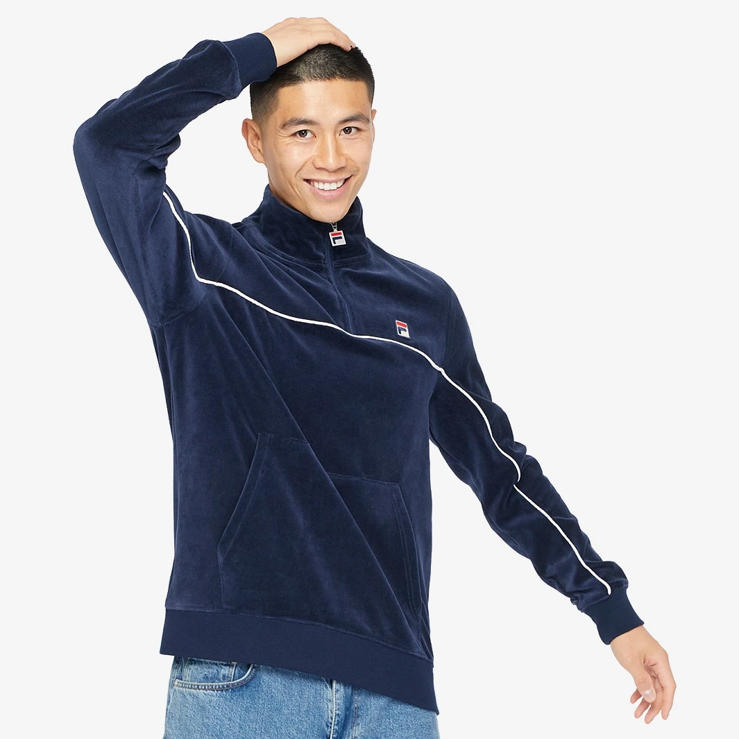 This Fila Navy Vintage Duke Half Zip Sweatshirt in Navy/Egret features an allover velour fabric pattern with a stand up collar and a half branded zip closing at the neck. Long sleeves with ribbed cuffs,...