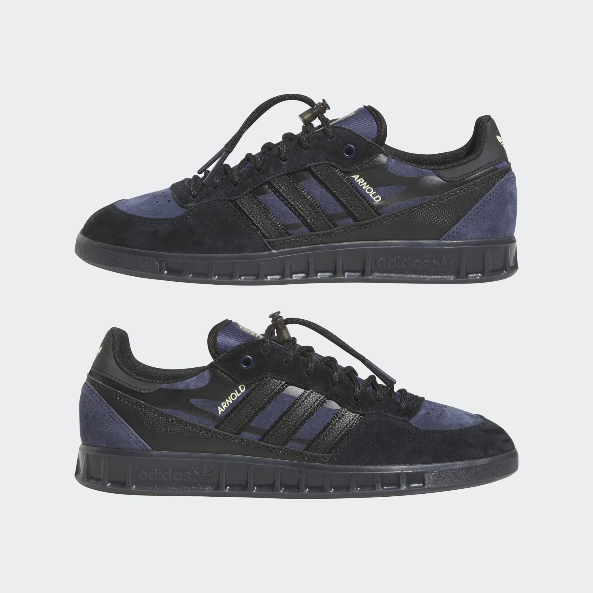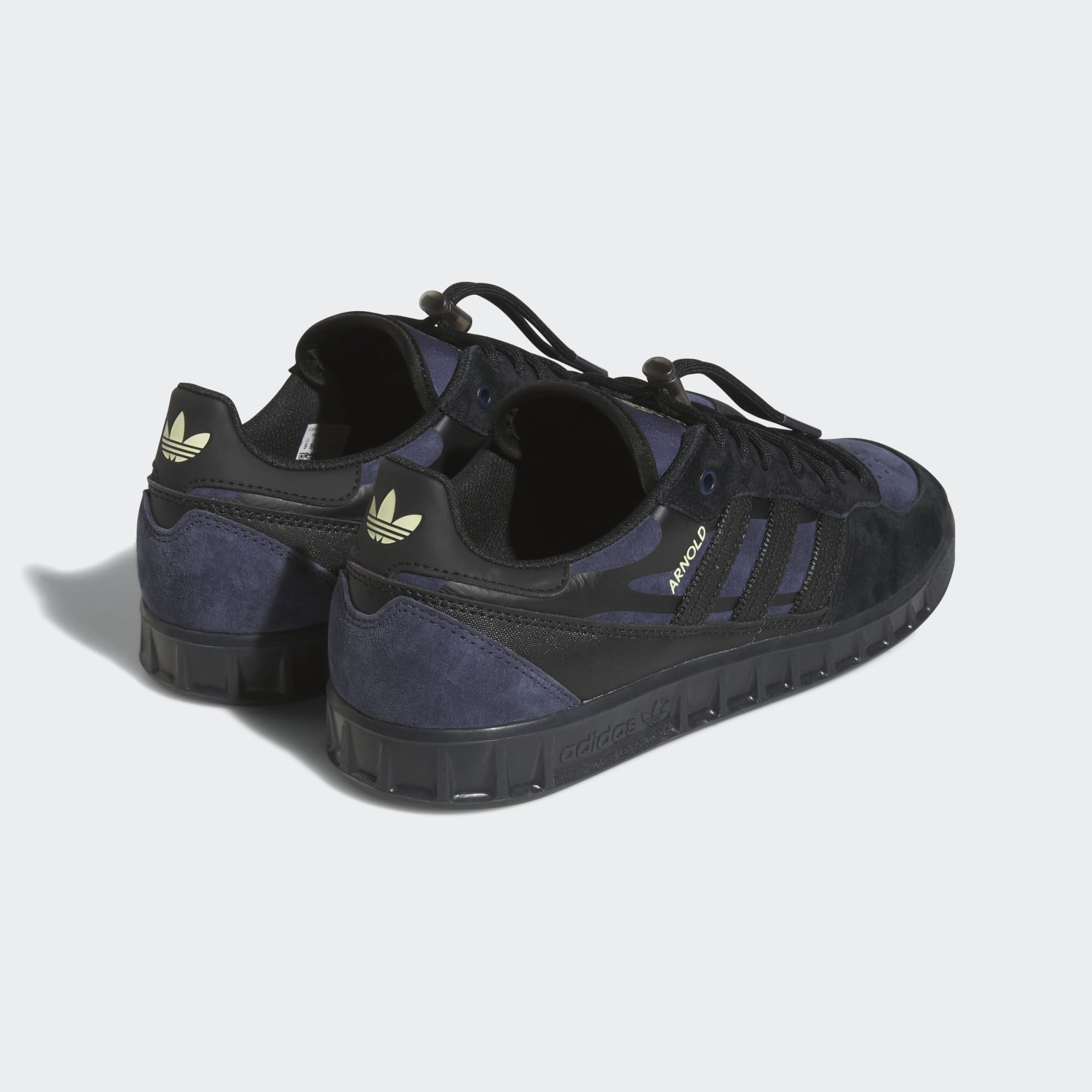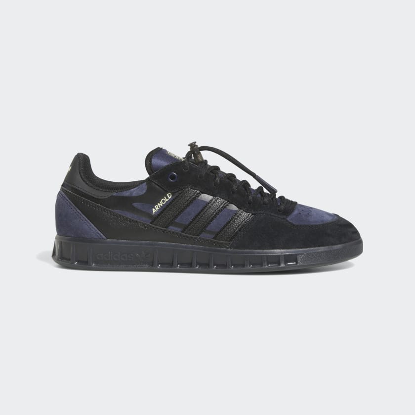 The adidas Handball Top x Mike in Core Black/Shadow Navy/Pulse Yellow draws inspiration from Mike Arnold's unconventional skating style, merging two distinct realms to form a fresh creation.