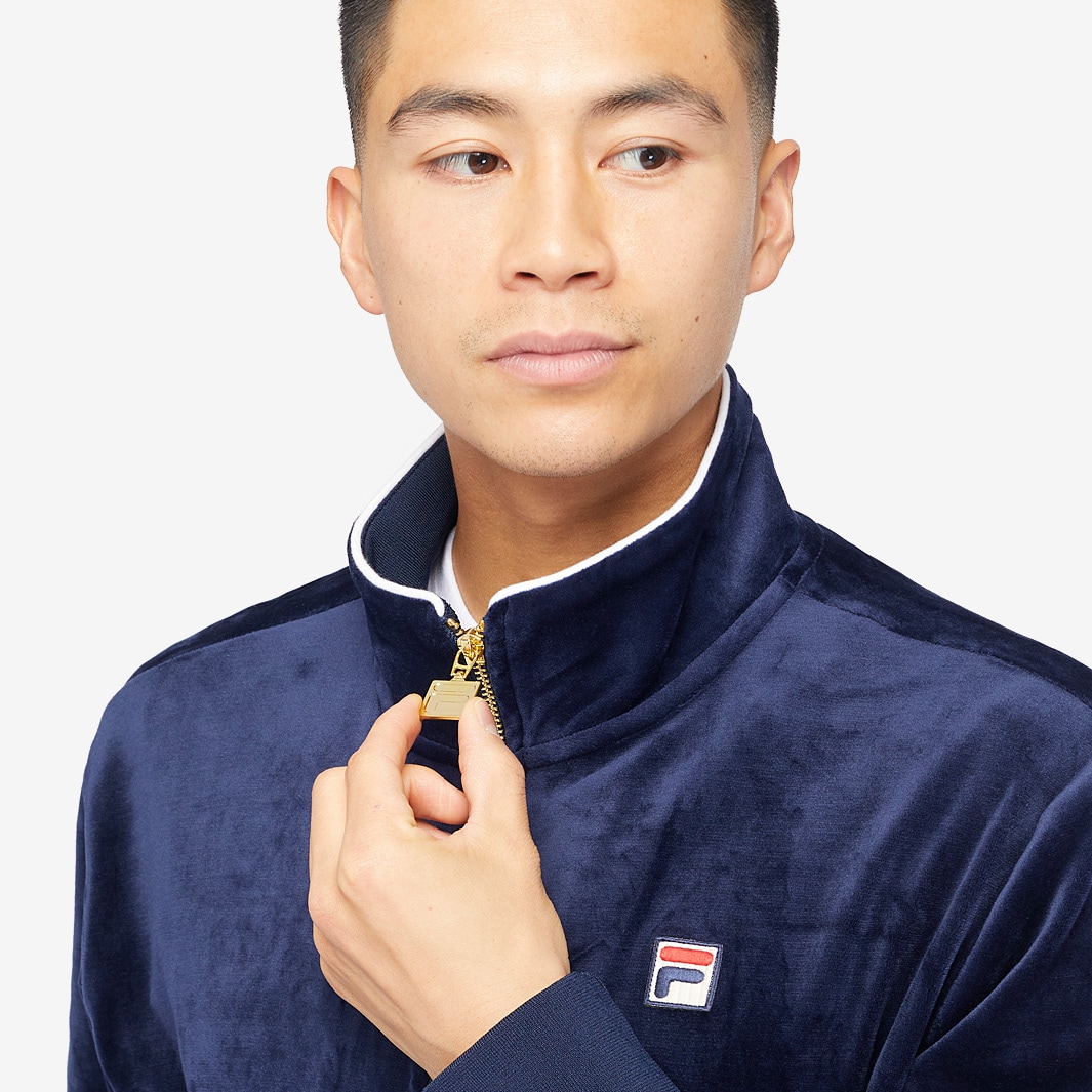 Complete any outfit in comfort and style with the FILA Heritage Irving Velour Track Top in Navy, the soft and cosy jacket featuring a FILA logo on the chest and a gold zip that completes and elevates your look.