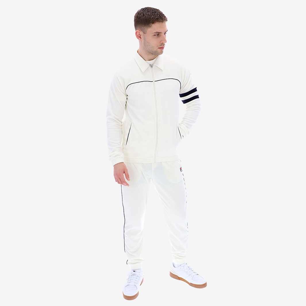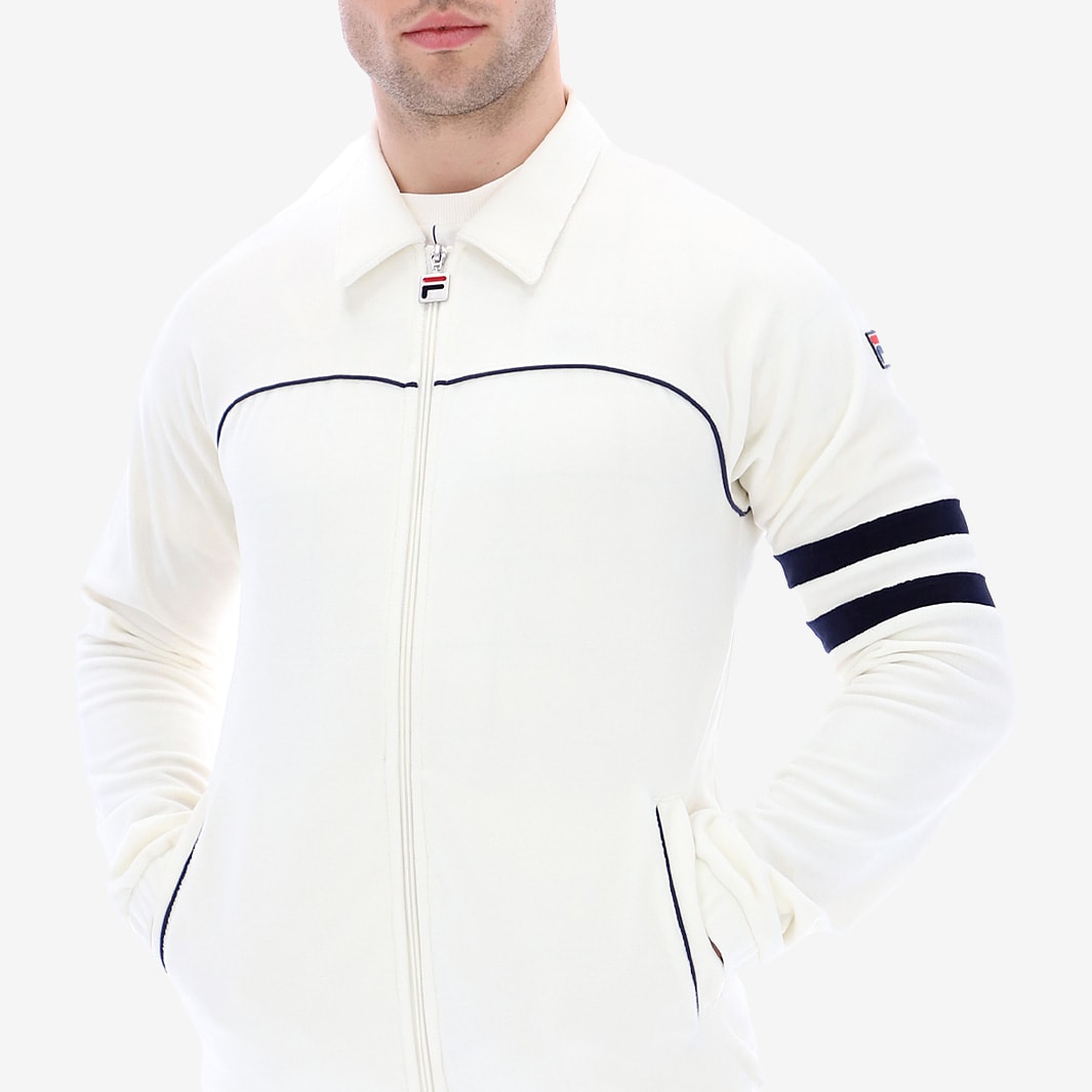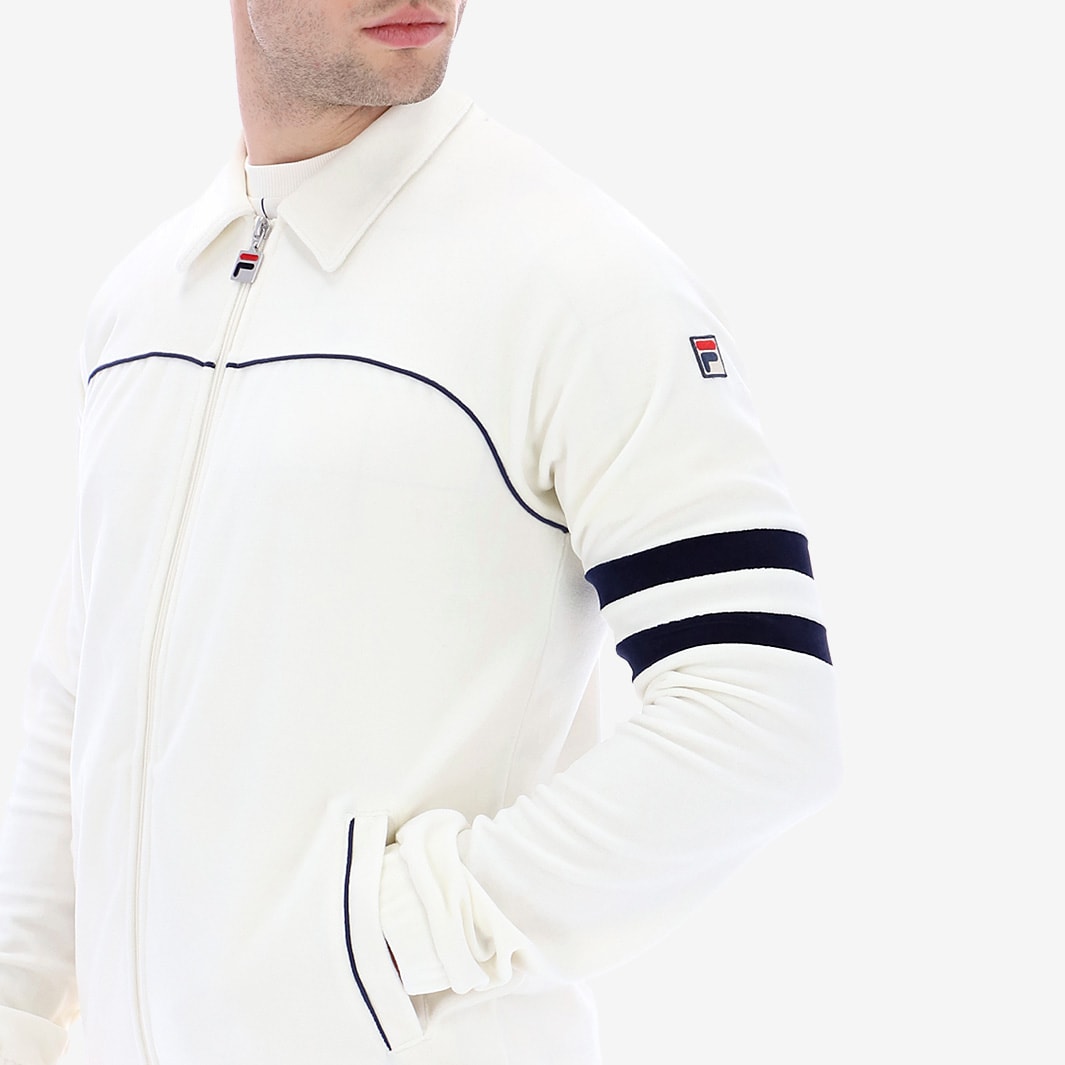 The FILA Heritage Verdy Velour Track Top in Marshmallow and Peacoat shows off iconic style on a classic build, with distinct contrast stripes, piped details and FILA branding.