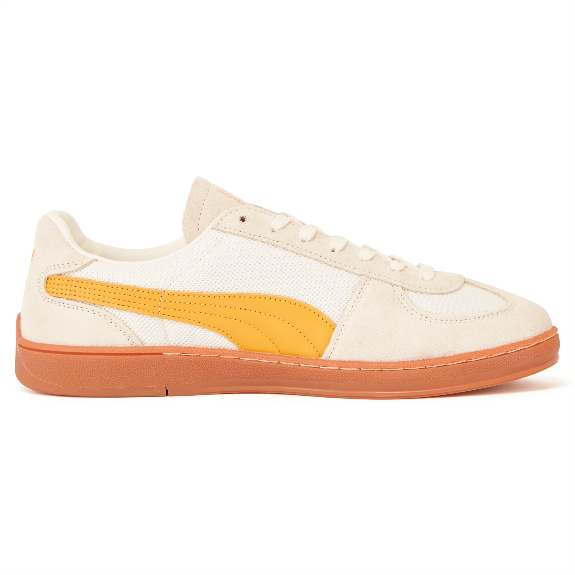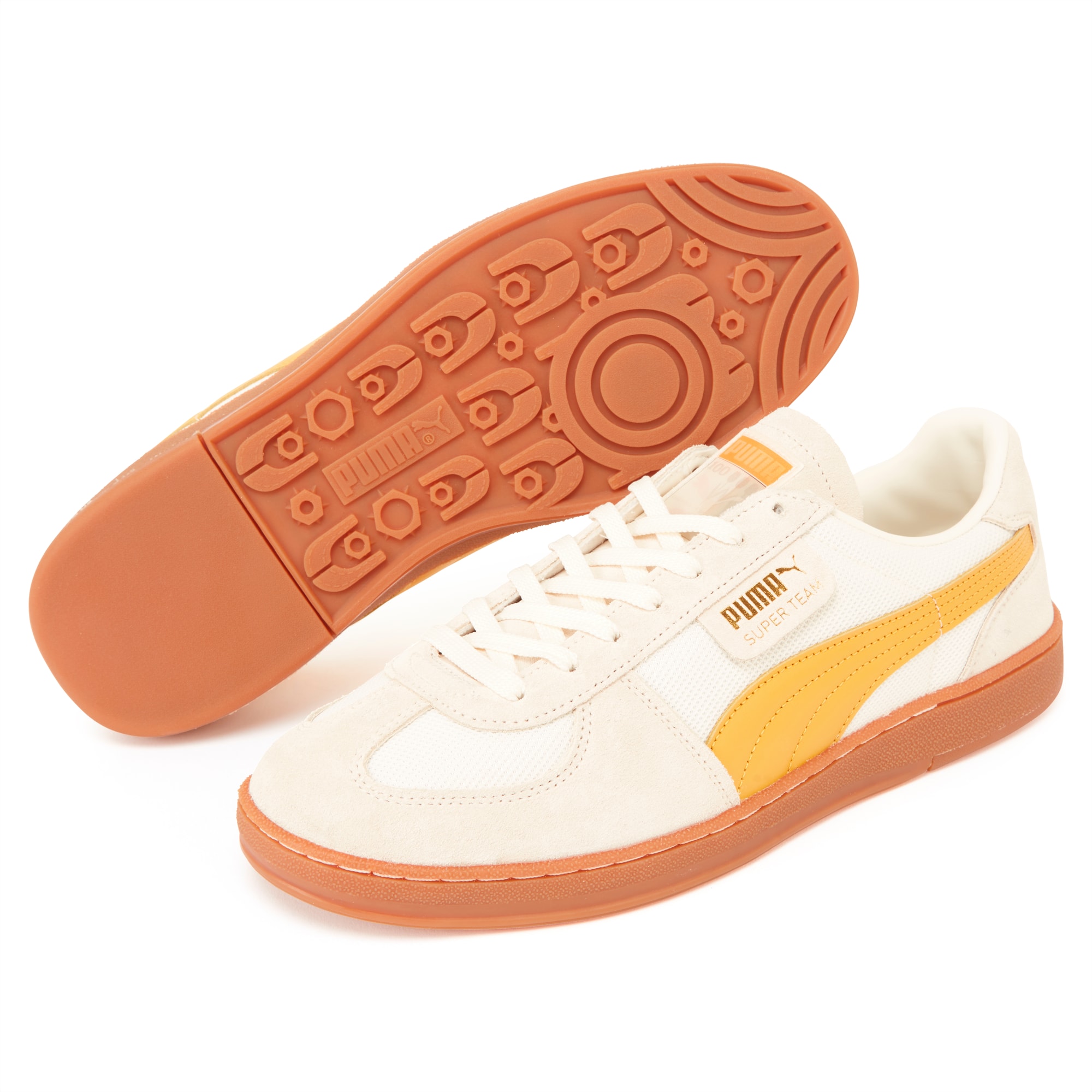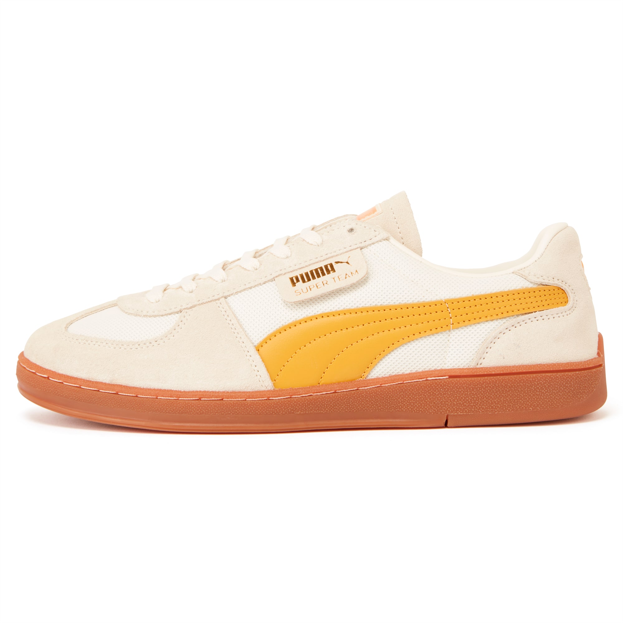 The shoe's off-white upper is a striking contrast against the mixture of mesh and suede, and the addition of a Apricot leather formstrip adds a pop of colour. Other notable features include suede flaps on the lateral sides with gold-foiled branding and a tongue graphic that pays homage to currency. Overall, the Super Team remains a timeless classic that has been given a modern update.