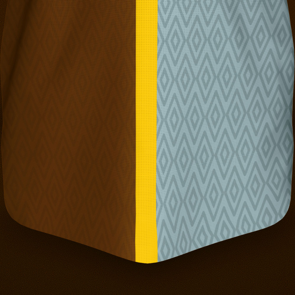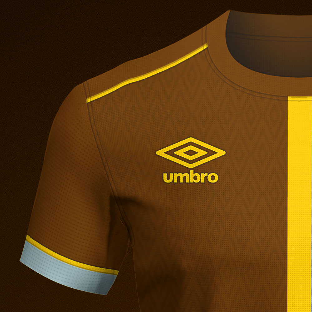 Based on the very first design used by the club in 1884, this Derby County shirt designed by ONI has brown and light blue halves with an Umbro-inspired double diamond pattern and an amber stripe in the middle.