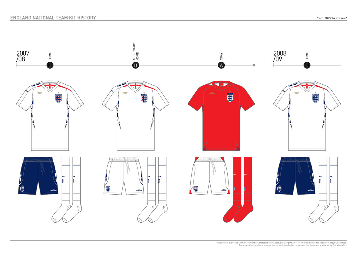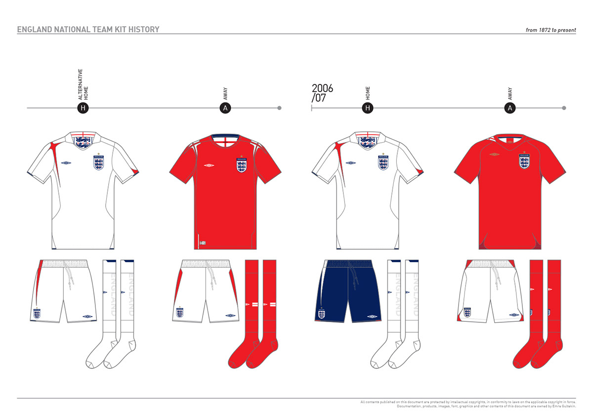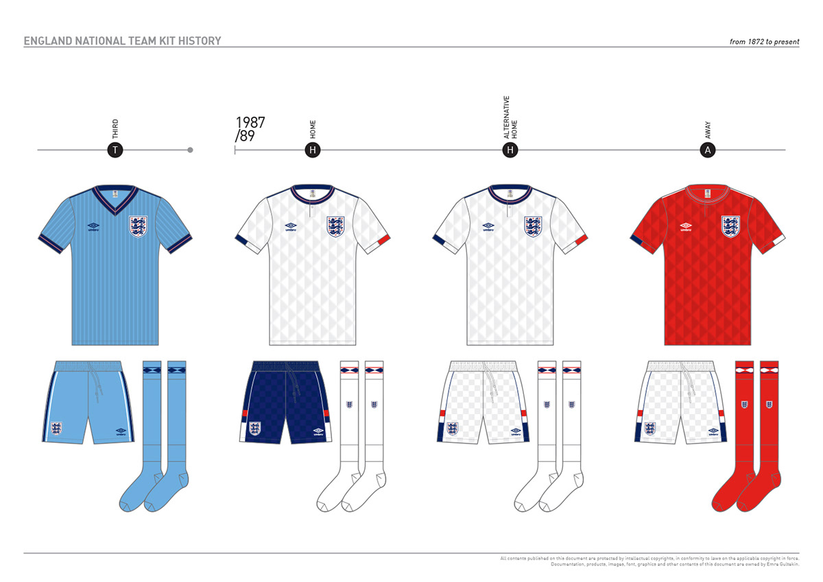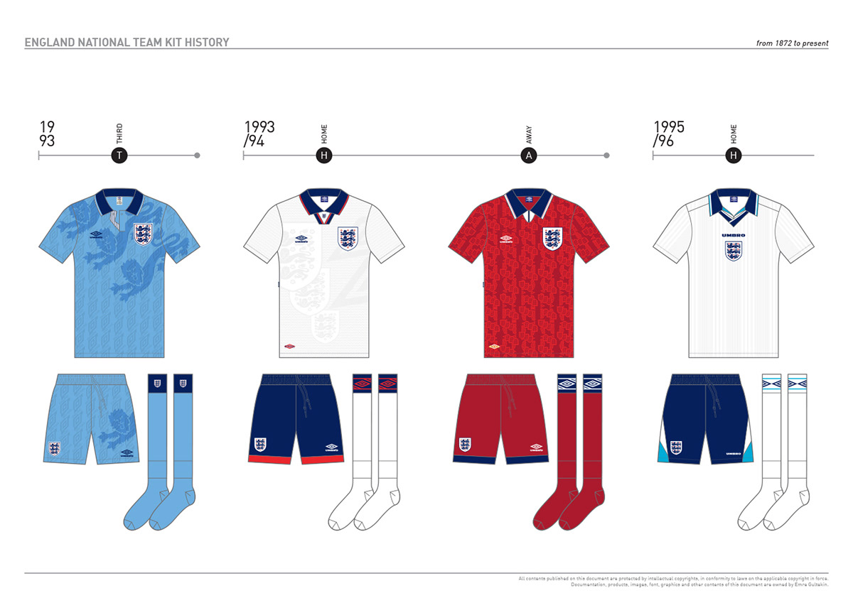 Graphic designer and sportswear designer - currently Senior Sportswear Designer at Fanatics - Emre Gultekin has added to his catalogue of kit histories with this gallery of England’s shirts, shorts and socks.