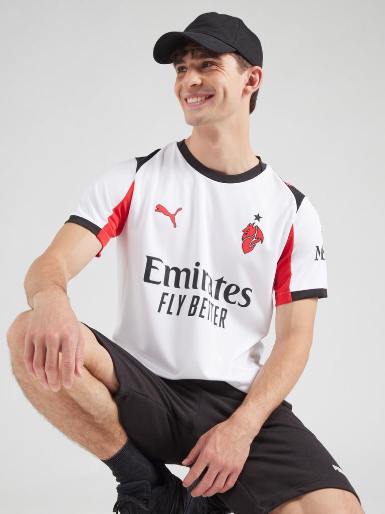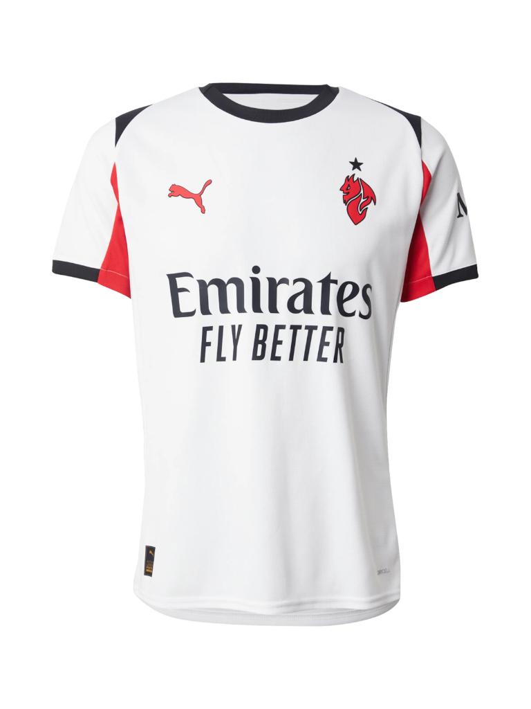The Puma logo appears in red on the right chest, while the "II Diavolo" (The devil) emblem replaces the traditional club crest on the left, topped by a black star. Black sponsor branding from Emirates Fly Better spans the front, and the sleeves include secondary sponsorship and additional Puma logos.