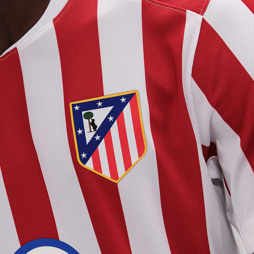 The Nike design maintains Atlético’s traditional red and white vertical stripes, applied across the front, back, and sleeves. A solid white square panel appears on the back to accommodate player names and numbers, interrupting the stripe pattern.