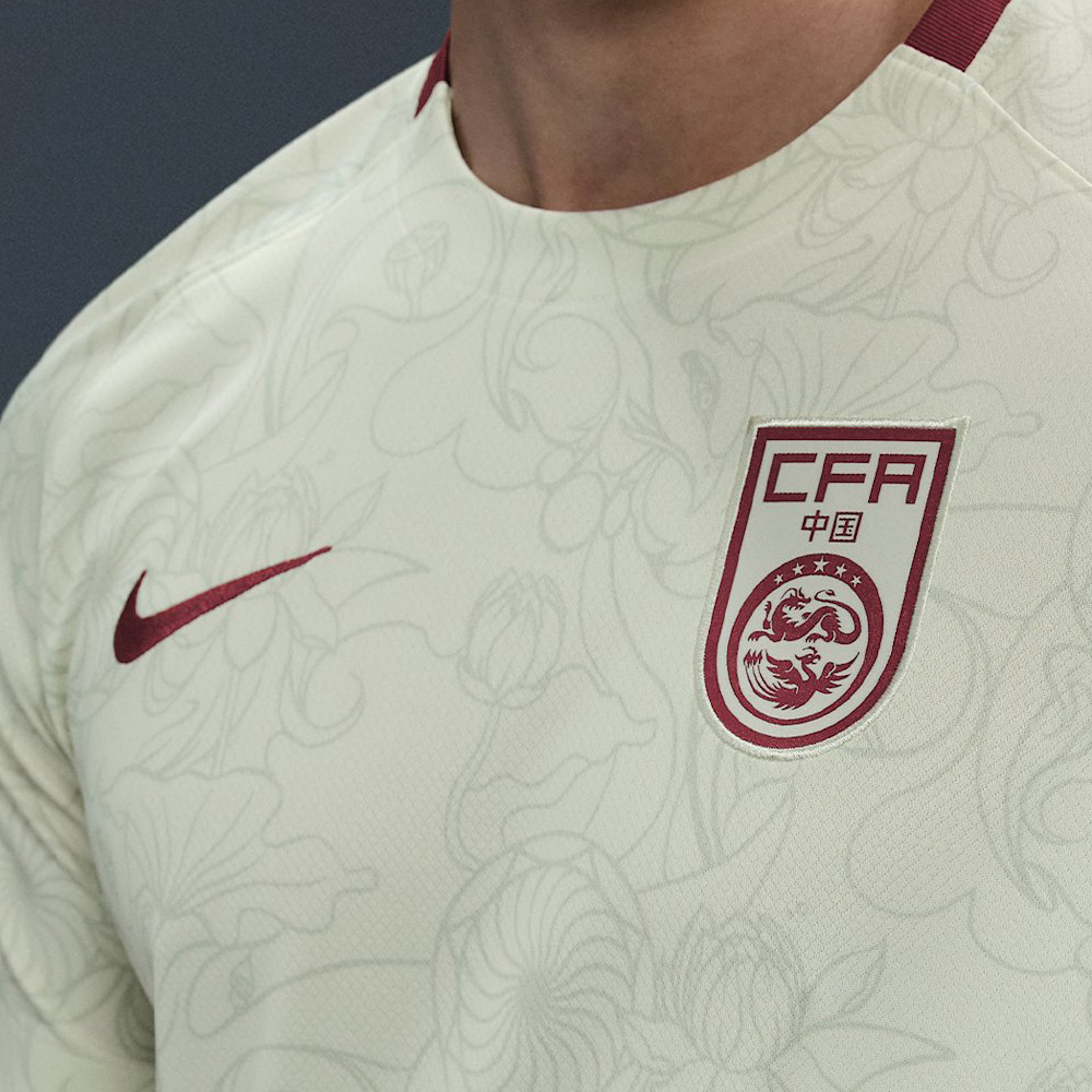 The shirt features a light beige tone with a subtle all-over floral pattern, possibly inspired by traditional Chinese motifs such as the lotus and peony. The Nike Swoosh and China Football Association (CFA) crest are both applied in dark red. A contrasting red insert appears at the neckline, and the side panels are finished in grey.