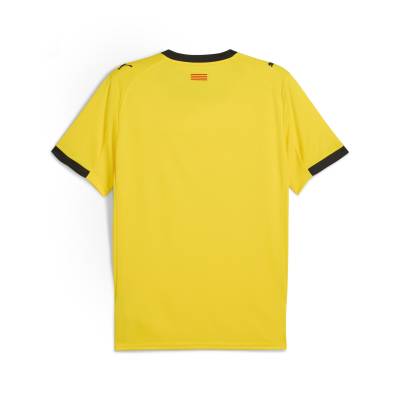 The back of the shirt includes the Catalan flag detail positioned below the neckline. Like other Puma kits, it uses the brand’s moisture-wicking “DryCELL” performance fabric, with a tag near the hem indicating this technology. No shorts or socks were shown in the images, but based on the shirt’s colour scheme, black or yellow elements are likely to feature in the full kit.