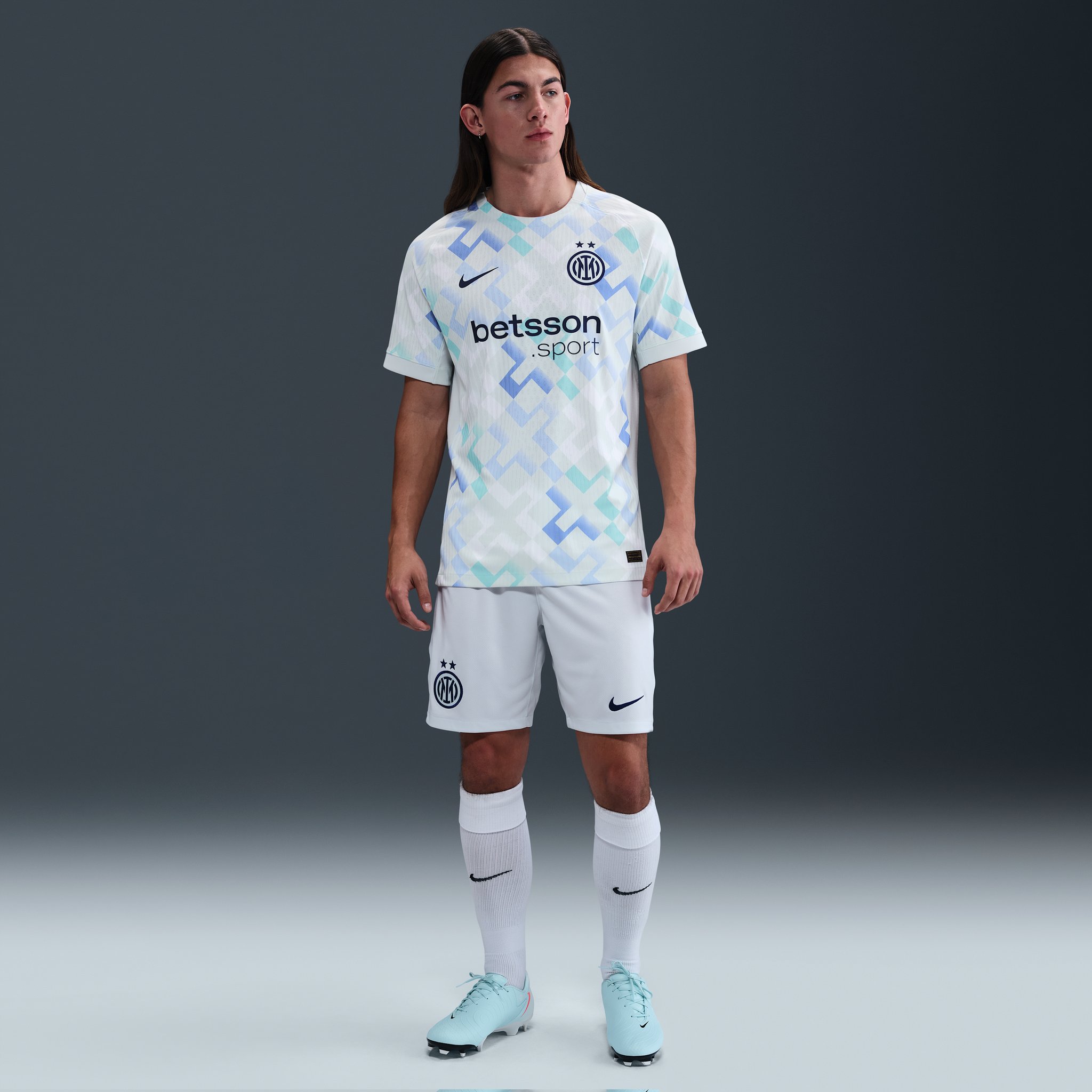 The shirt features a white base with a geometric pattern made up of light blue, turquoise, and soft green tones across the front and sleeves. The club’s updated badge is placed on the left chest, while the Nike Swoosh appears on the right. Betsson Sport is featured as the shirt sponsor.