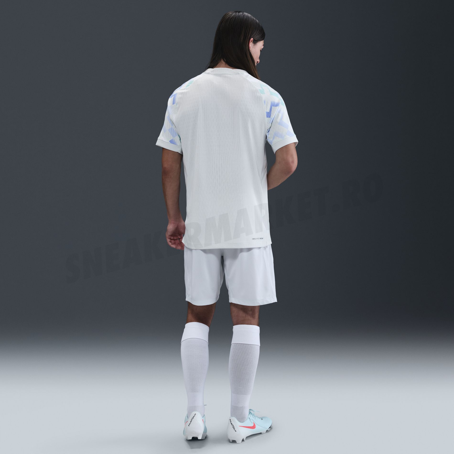 The back of the shirt is predominantly plain white, with the geometric detailing restricted to the sleeves. The kit is completed with white shorts and socks, featuring black Nike branding and Inter’s crest on the shorts.