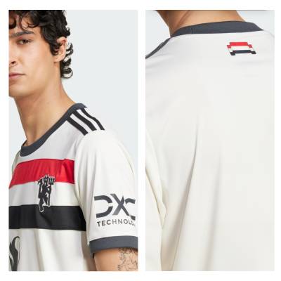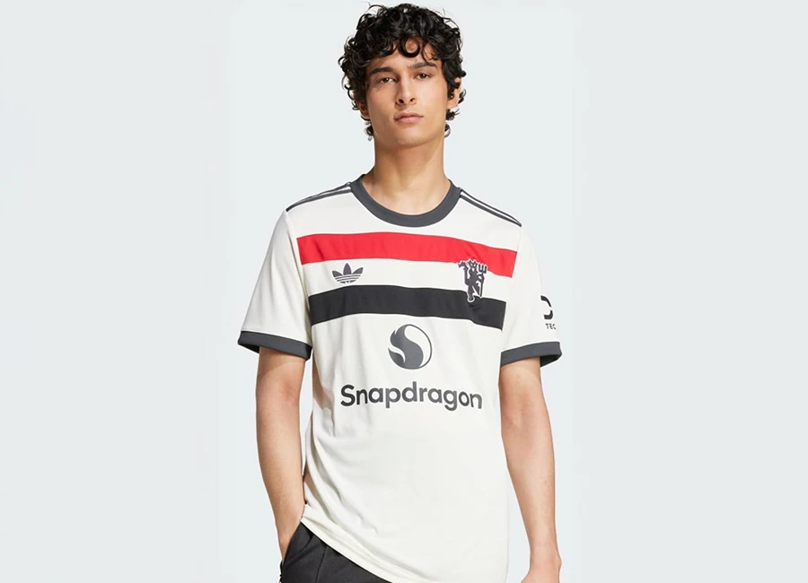 Seeing the return of the Trefoil logo from the German supplier, this soon-to-be-unveiled new white release has this element, along with the simple devil crest, mounted onto a triband-flag chest feature that portrays the Premier League giants’ first-choice colours of red (shirt), white (shorts) and black (socks) - with the logo of new sponsor “Snapdragon” below.