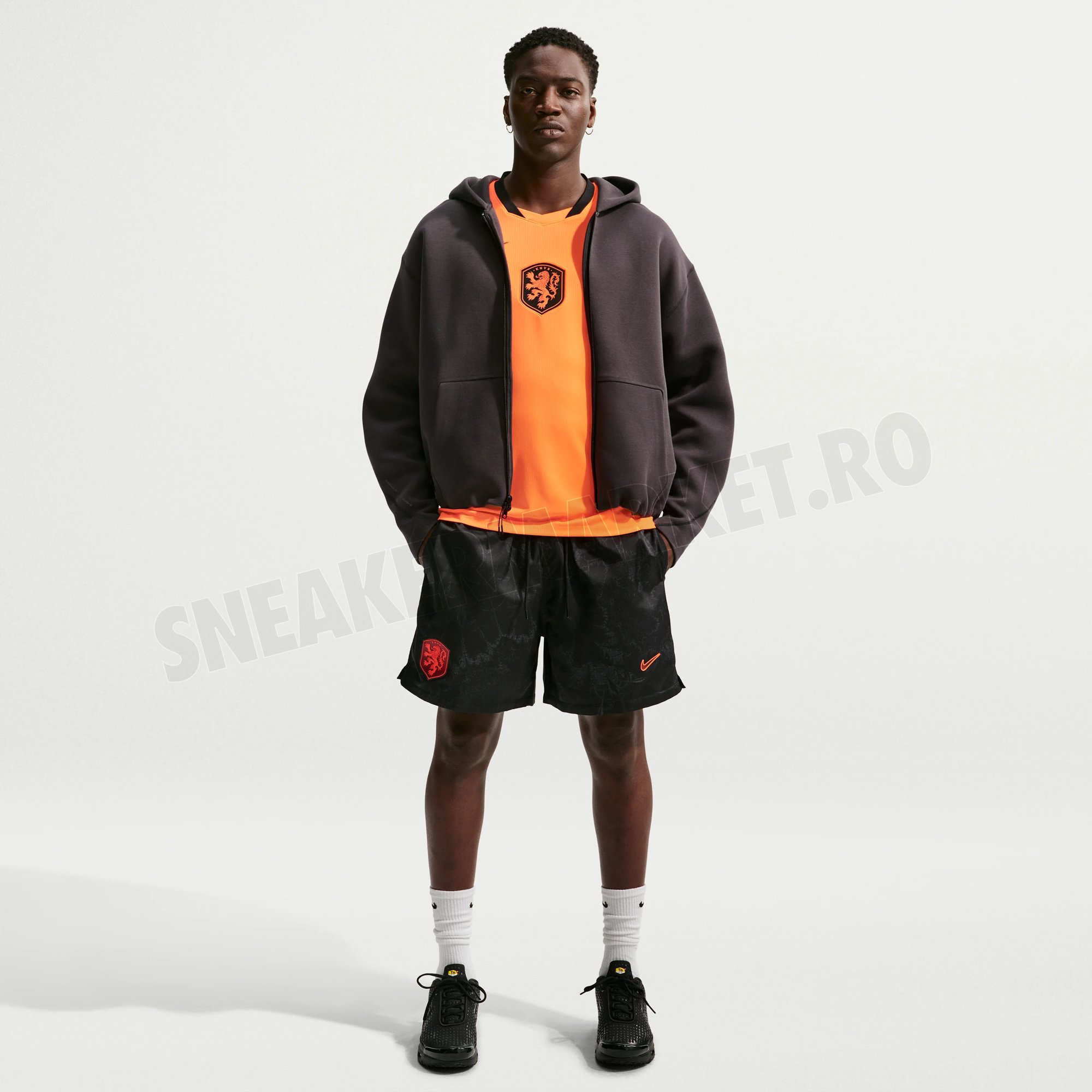 The Netherlands football shirt appears in the nation’s traditional orange colourway, paired with black detailing applied to the collar, sleeve cuffs and side panels. A black Nike Swoosh is positioned on the right chest, while the KNVB crest sits centrally in a tonal orange and black finish.