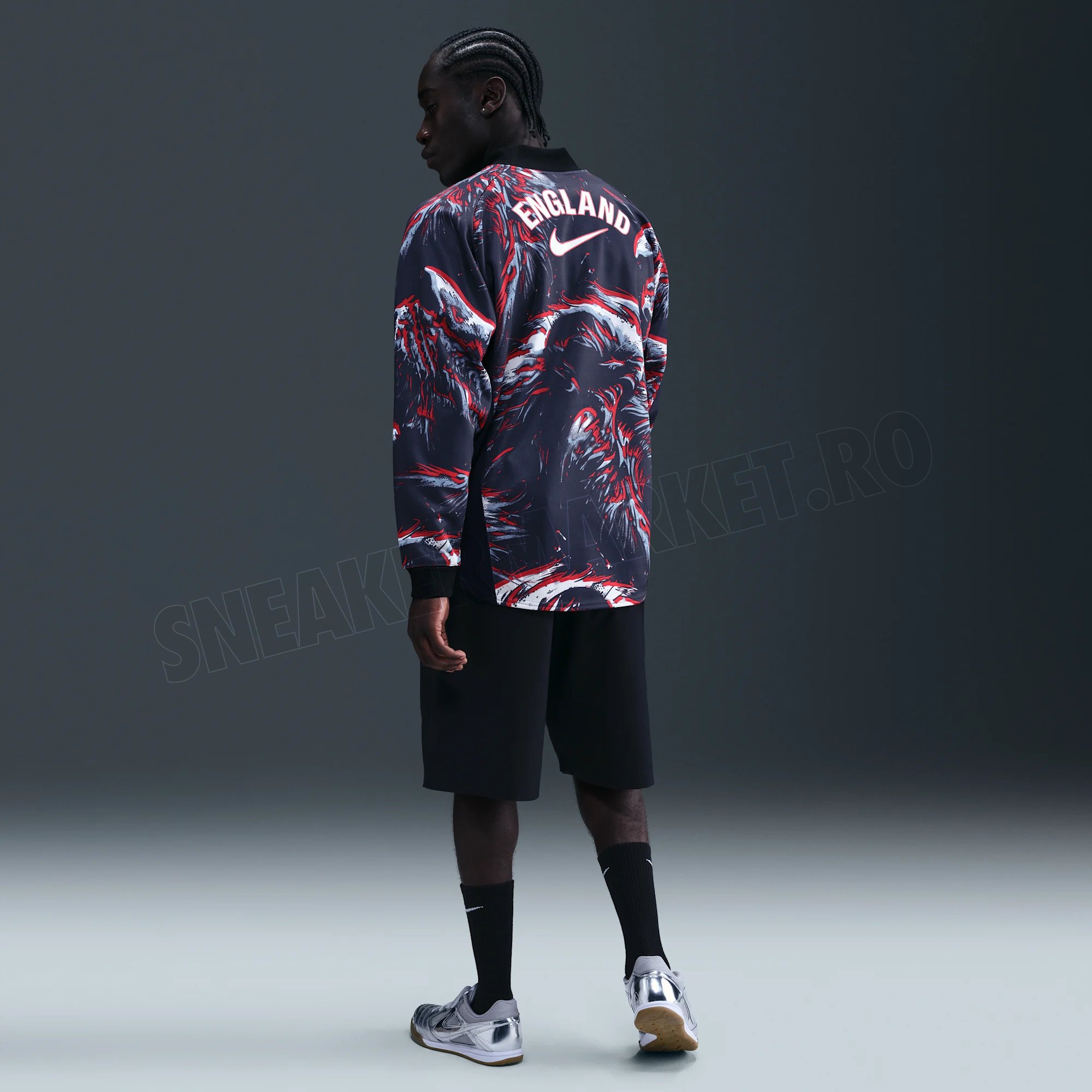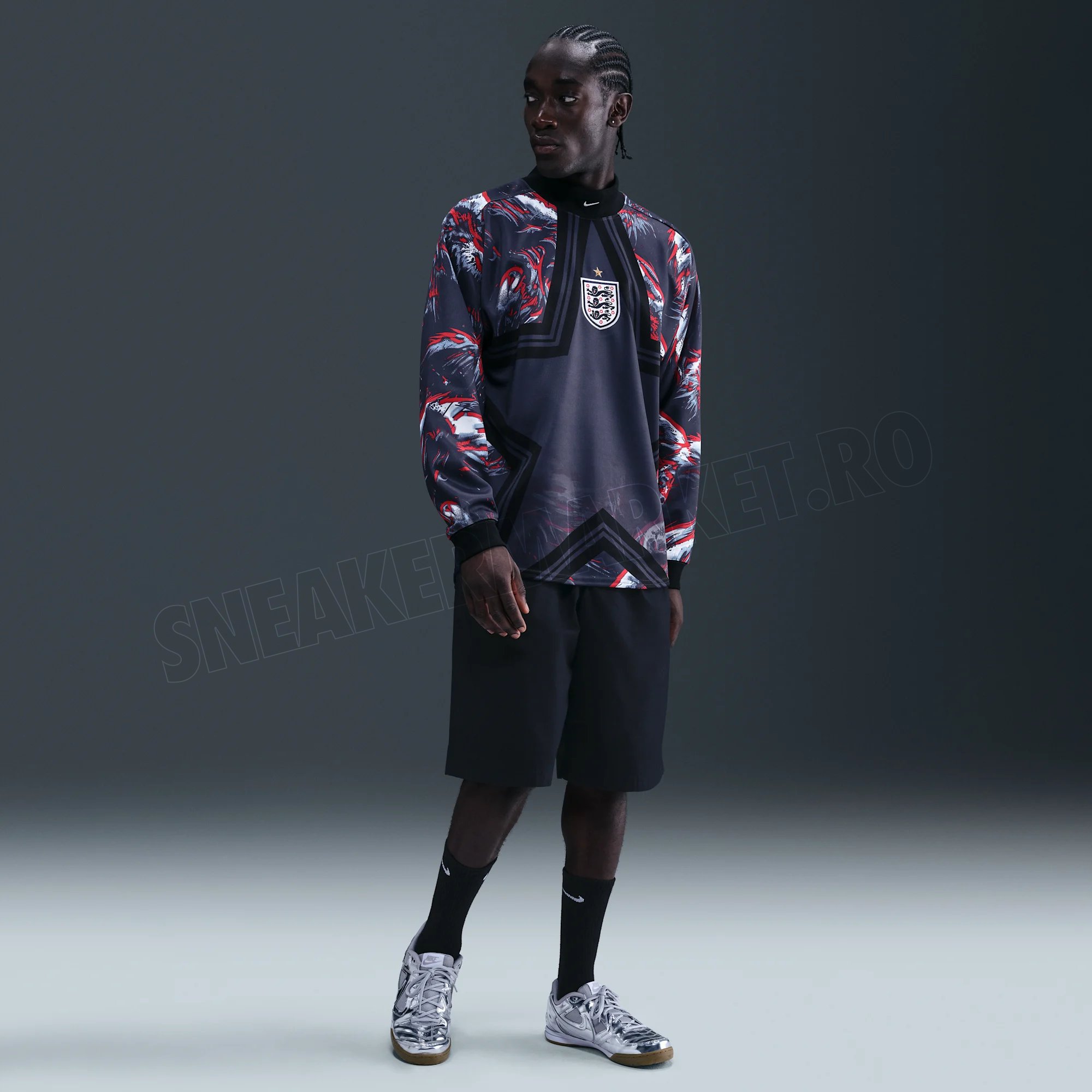 On the back, “ENGLAND” appears in bold lettering above a large white Swoosh, completing the visual identity of the shirt. Its high collar, ribbed cuffs, and loose fit reference classic goalkeeper silhouettes from the mid-90s era.