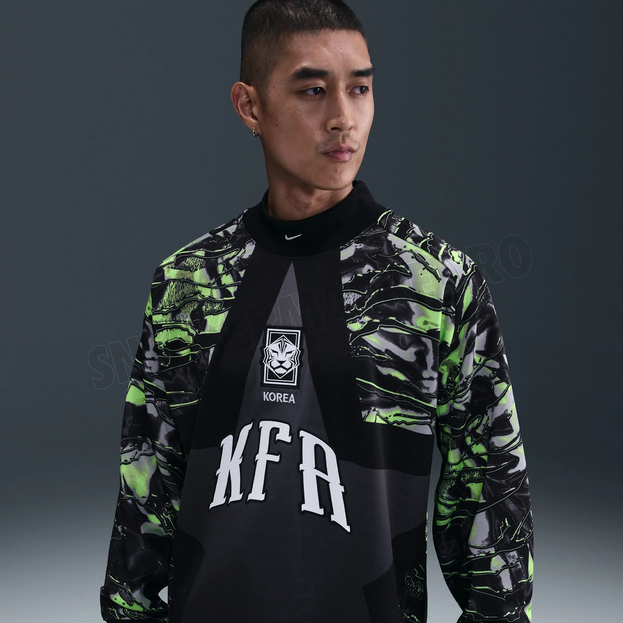 The long-sleeved design presents a black base with a central tonal star panel, displaying the Korea Football Association crest and bold “KFA” lettering placed across the front in white. A small Nike logo appears on the collar, while a woven authenticity tag sits above the hem.