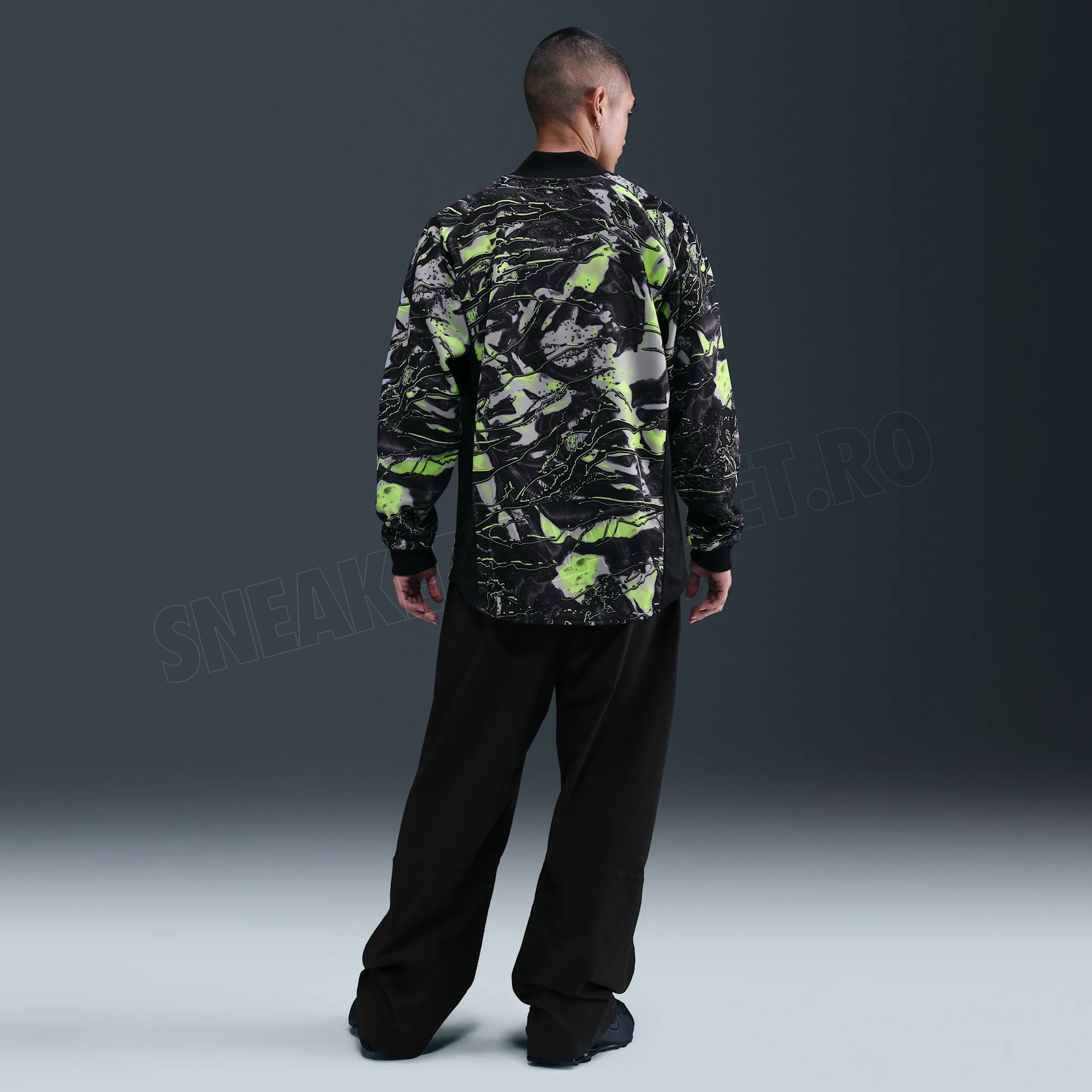Across the sleeves and back, the shirt incorporates a vivid marbled pattern in lime green, black, and grey tones. The piece includes ribbed cuffs and a fitted collar consistent with Nike’s latest leaked goalkeeper designs, suggesting a hybrid between matchwear and lifestyle apparel.