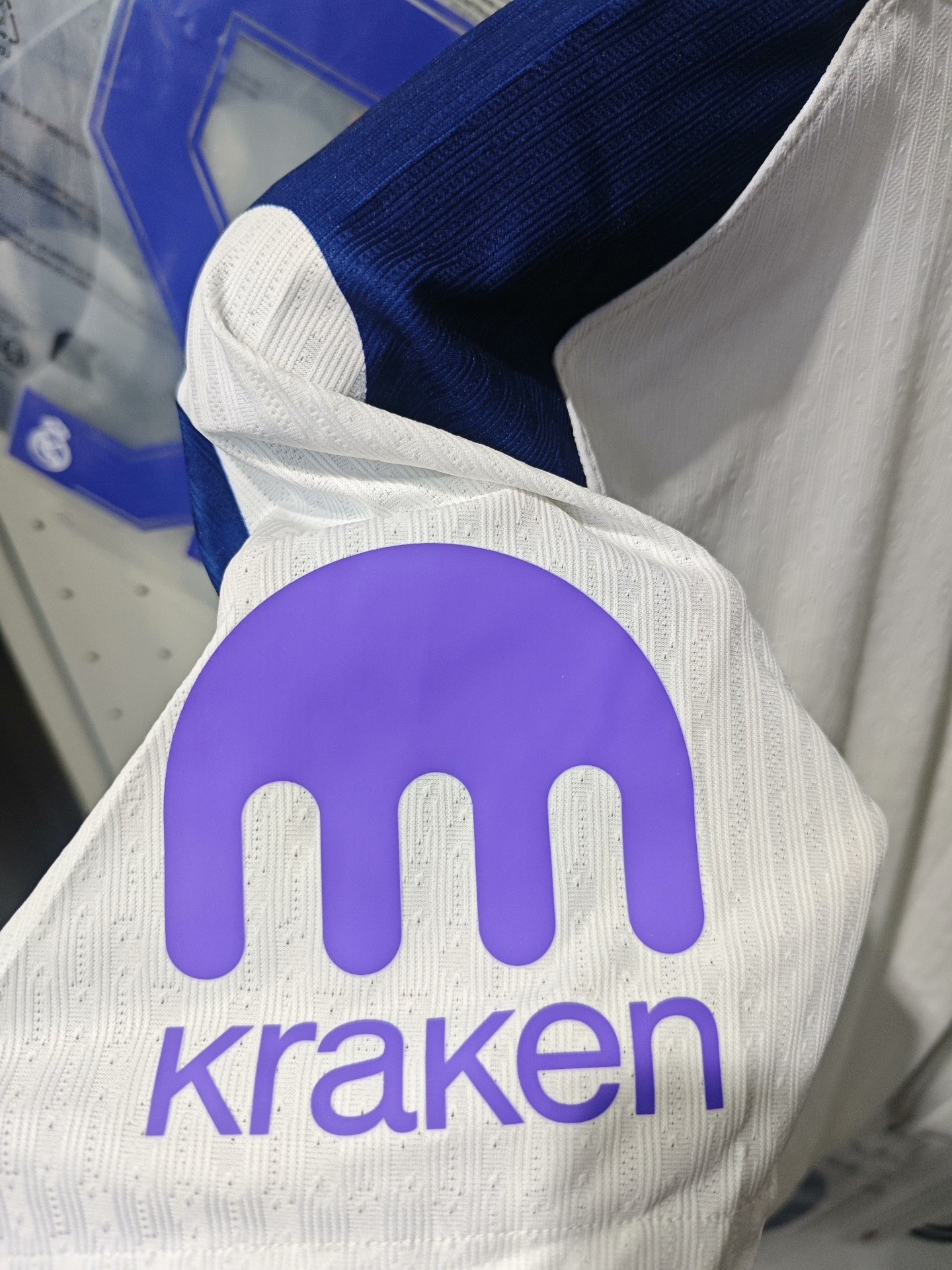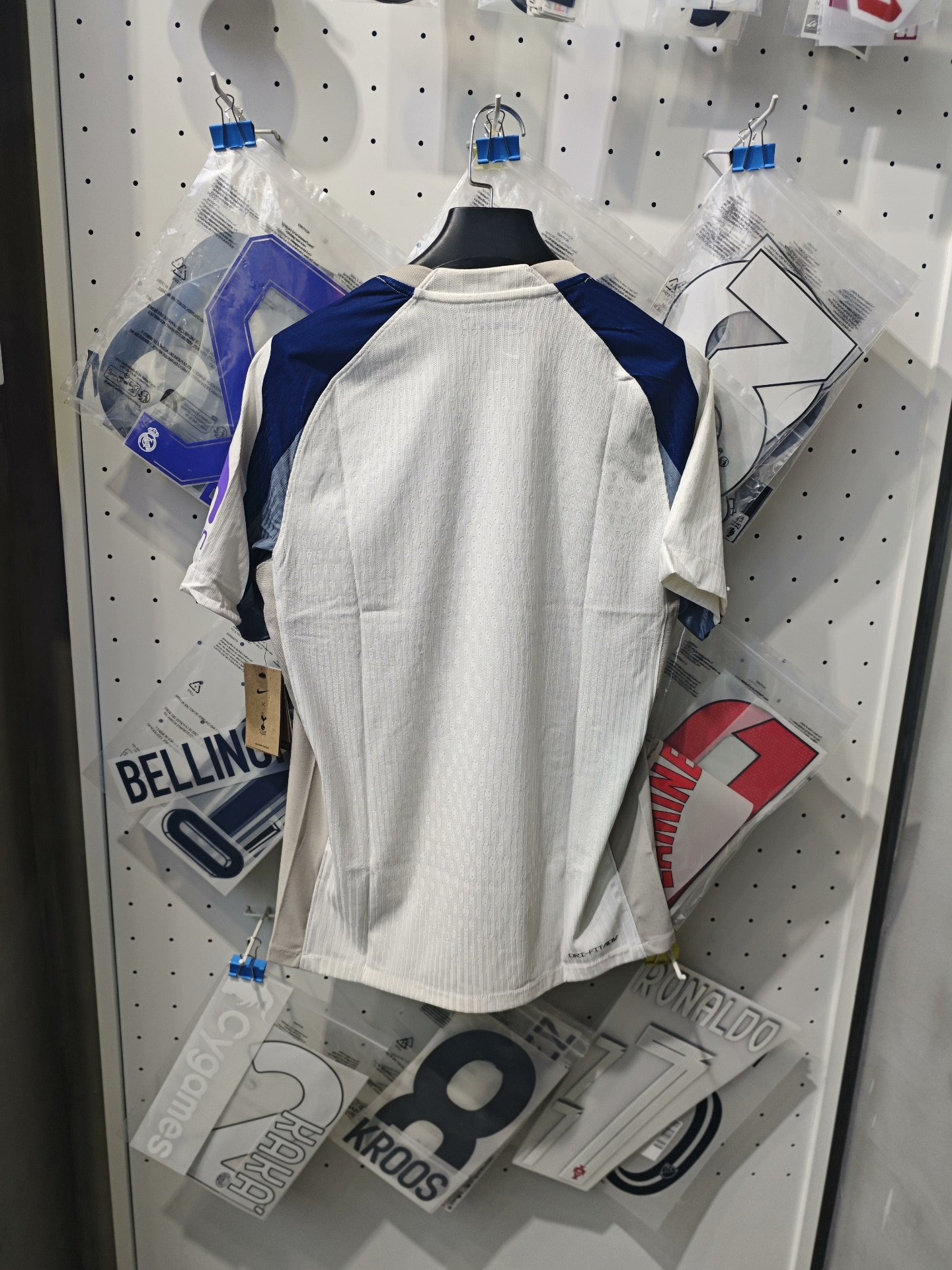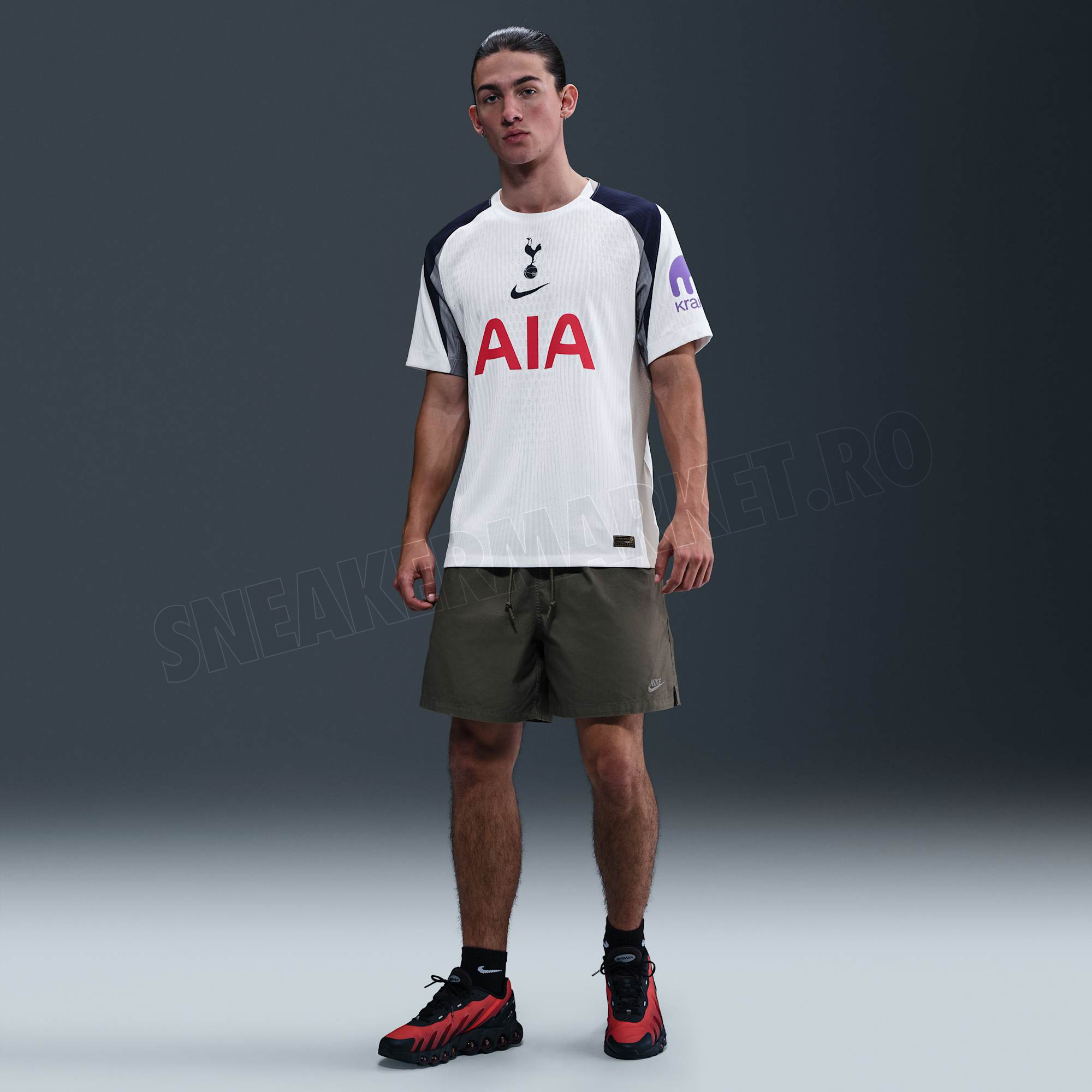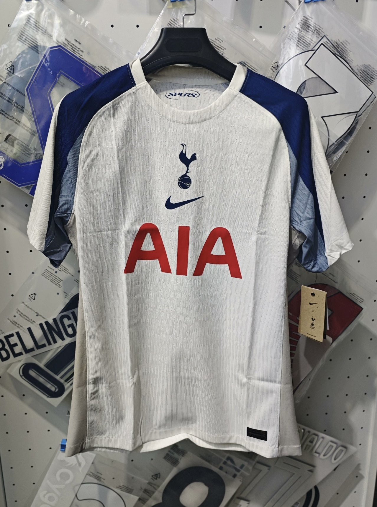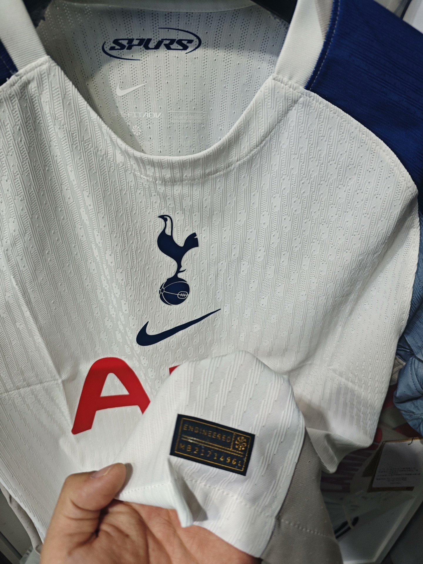 The front of the shirt includes the club’s cockerel crest, Nike logo, and main sponsor AIA, with the latter applied in red. Inside the collar, “SPURS” is printed in navy. The left sleeve displays the Kraken sponsor logo in purple. A black and gold “Engineered” authenticity label with a serial number is stitched near the hem. The inner collar also confirms the use of Nike’s Dri-FIT ADV performance technology.