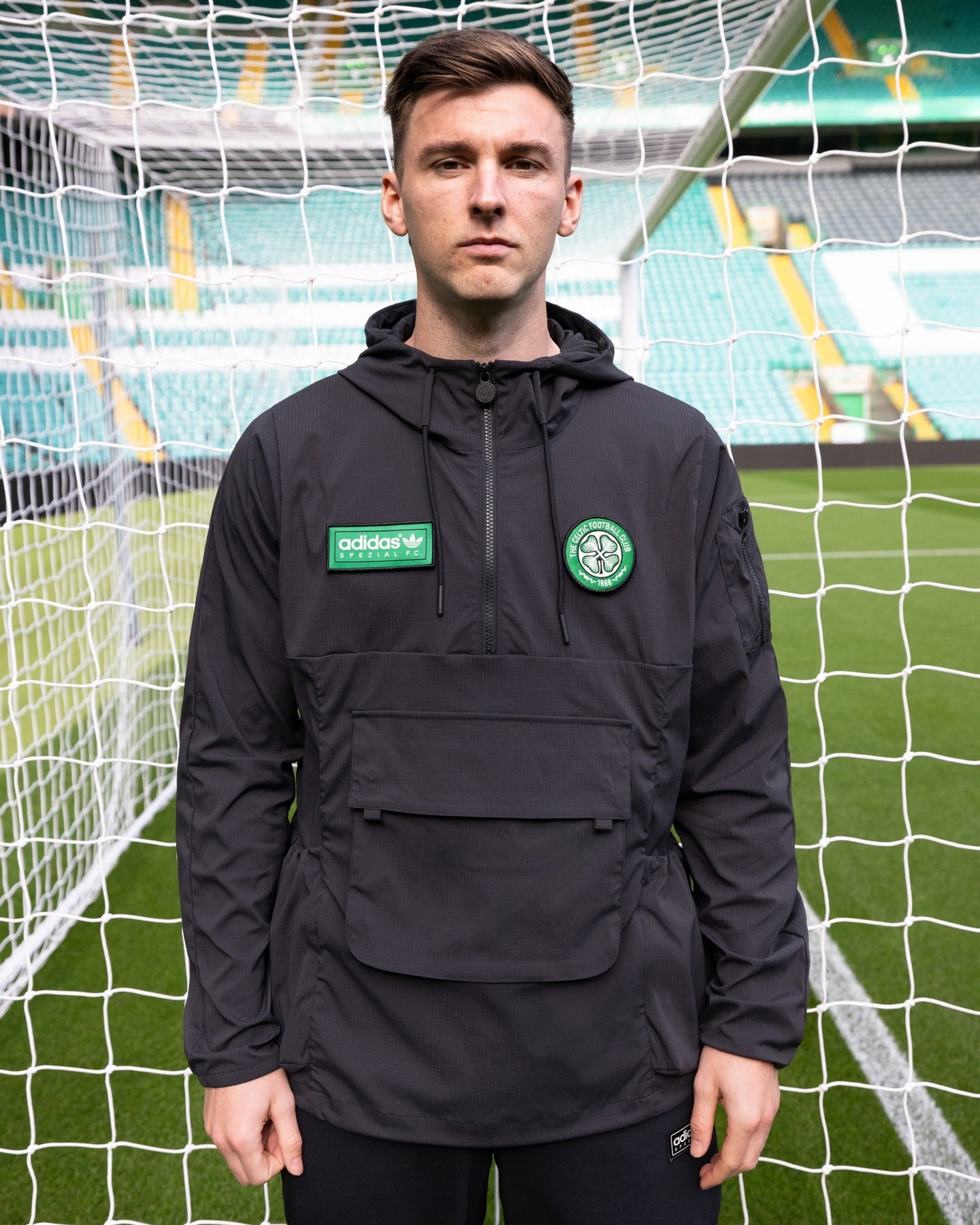 The adidas Originals range features a black anorak with embroidered Celtic and SPZL patch, a coordinating sweatshirt displaying a circular graphic emblem, and a cream T-shirt with dual branding across the front.