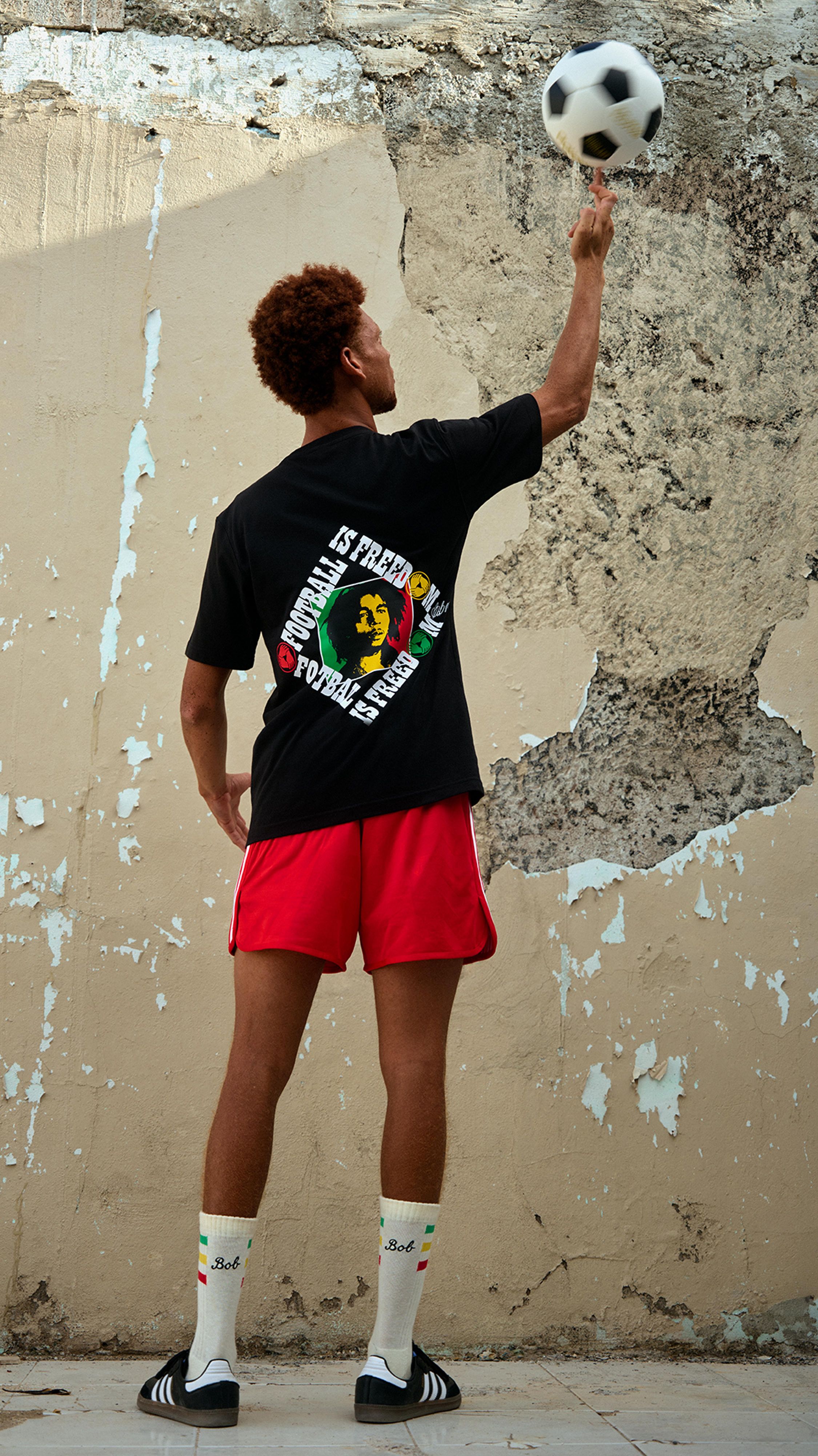 The collection features recurring graphic elements that appear across multiple items. A flowing wave pattern is applied throughout the range, referencing rhythm, movement and the cultural connection between football and music. The phrase Football is Freedom is integrated across key garments, reflecting Bob Marley’s long standing connection to the beautiful game.