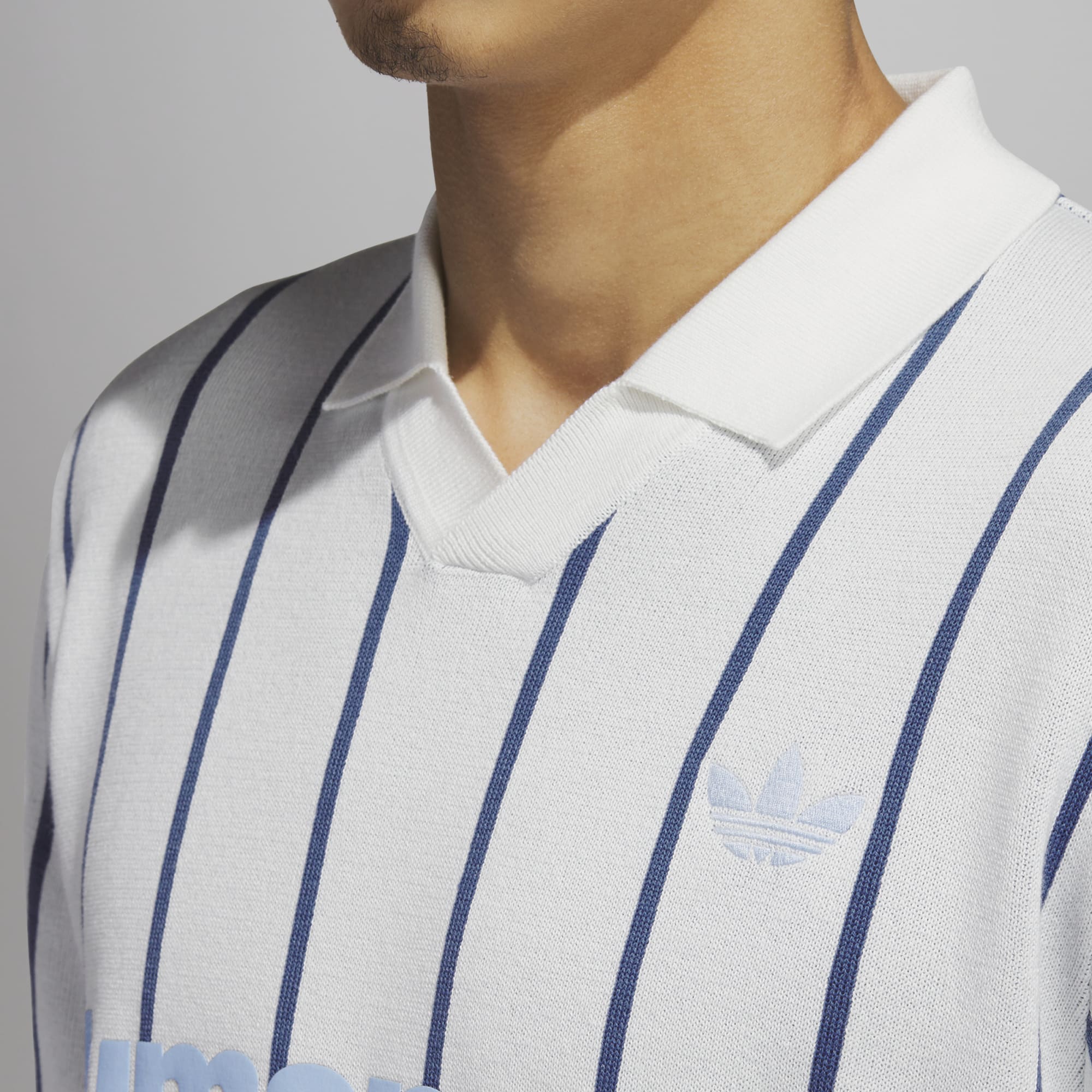 This Long Sleeve Pharrell Williams Knit Jersey in Cloud White forges a nostalgic connection to football culture through an exploration of timeless colors and archival cut lines.