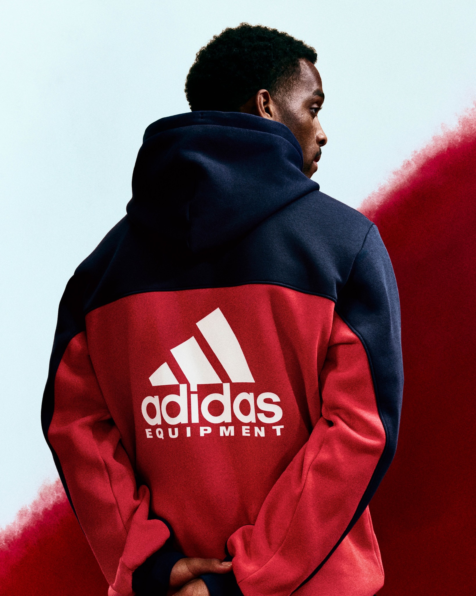 Supporting the main shirt, the Bring Back range includes a red and navy hoodie, a white T-shirt with the vintage crest, navy jogger pants, and adidas Gazelle trainers. The footwear features white uppers with blue and red three stripes, complementing the rest of the capsule.