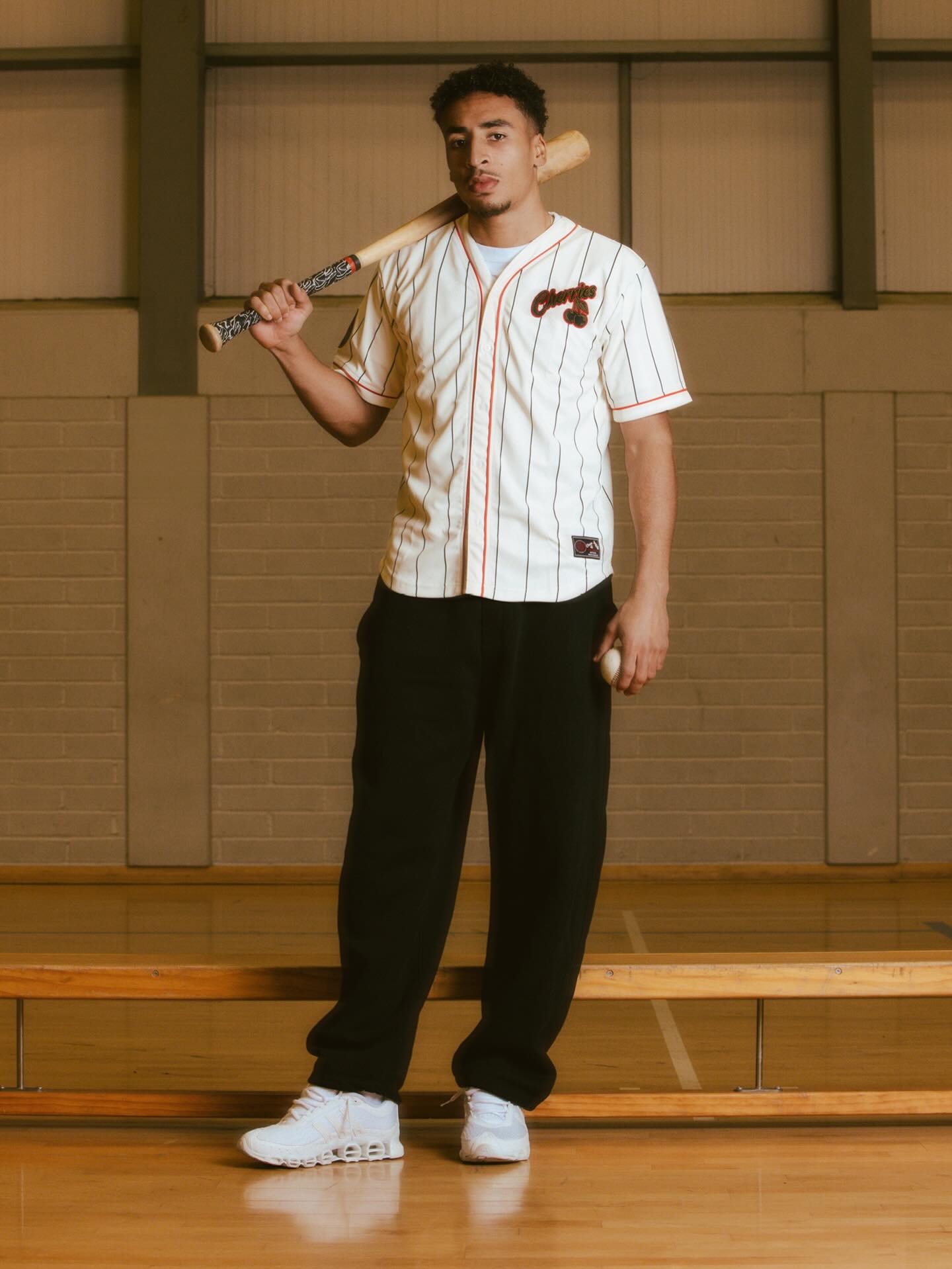 The AFC Bournemouth baseball jersey arrives in an off white base with black pinstripes and red piping along the placket and sleeves. Constructed from premium midweight fabric, the shirt is cut in a relaxed boxy fit. An embroidered Cherries script appliqué is positioned on the left chest, while the number 99 appears on the reverse in reference to the club’s 1899 formation year. A Cherries crest appliqué on the sleeve and AFCB initialling at the rear neck complete the detailing.