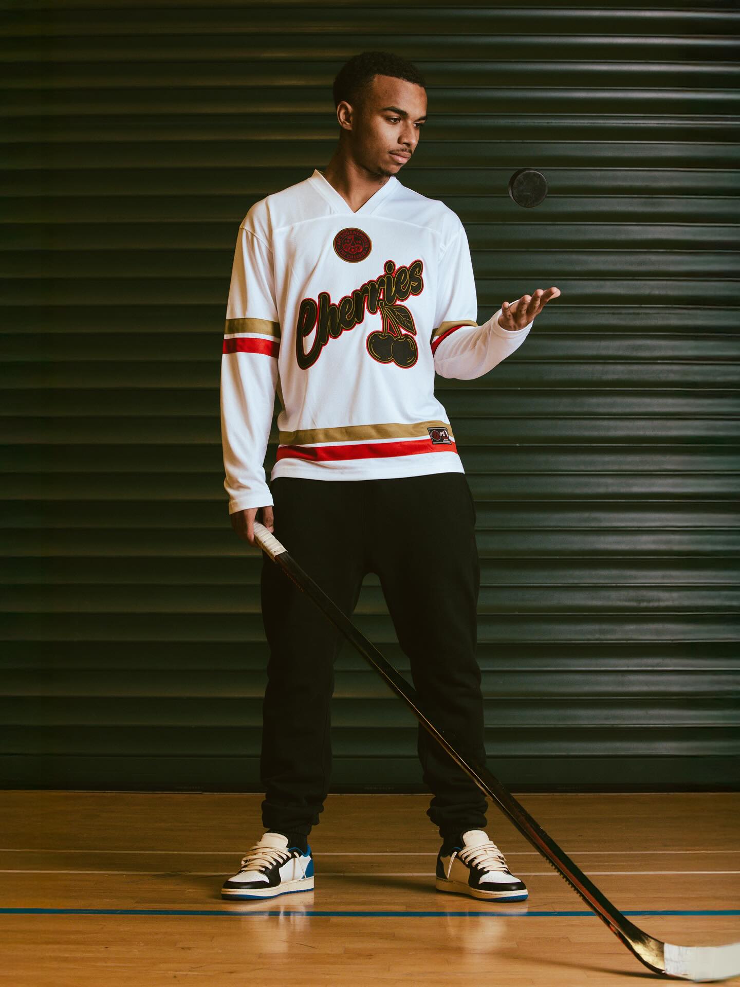 The Varsity Collection ice hockey jersey features a white mesh construction designed for lightweight comfort. Red and gold trim is applied to the sleeves and hem, framing a large embroidered Cherries graphic across the chest. The back carries the number 99, accompanied by further club detailing and rear neck initialling.