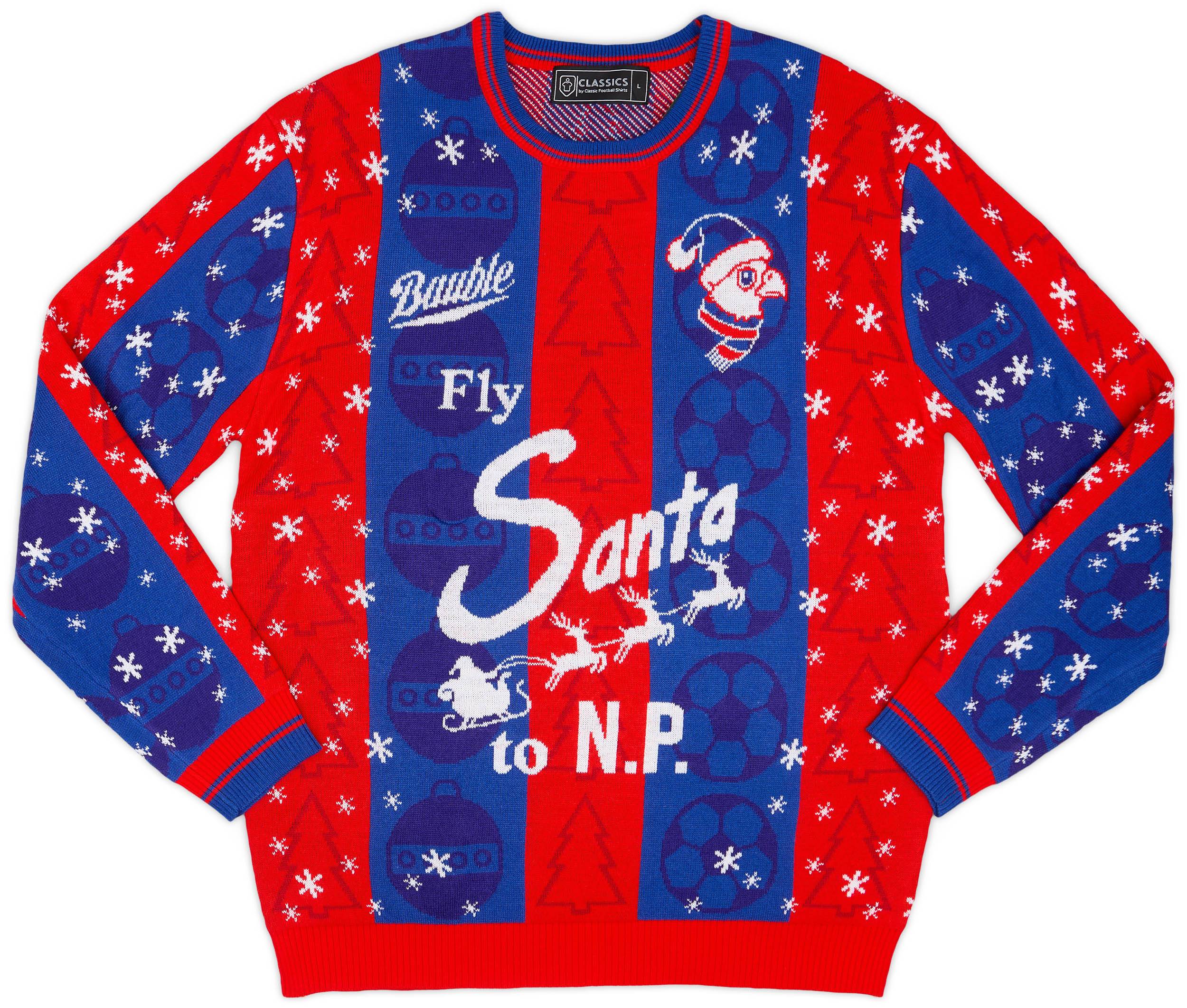 Details are switched to reference the gift-giving period that’s almost upon us, including the “to LA” addition of the match 34 years ago being replaced with “to N[orth ]P[ole]” and Palace’s eagle mascot sporting a bobble hat in the crest position.