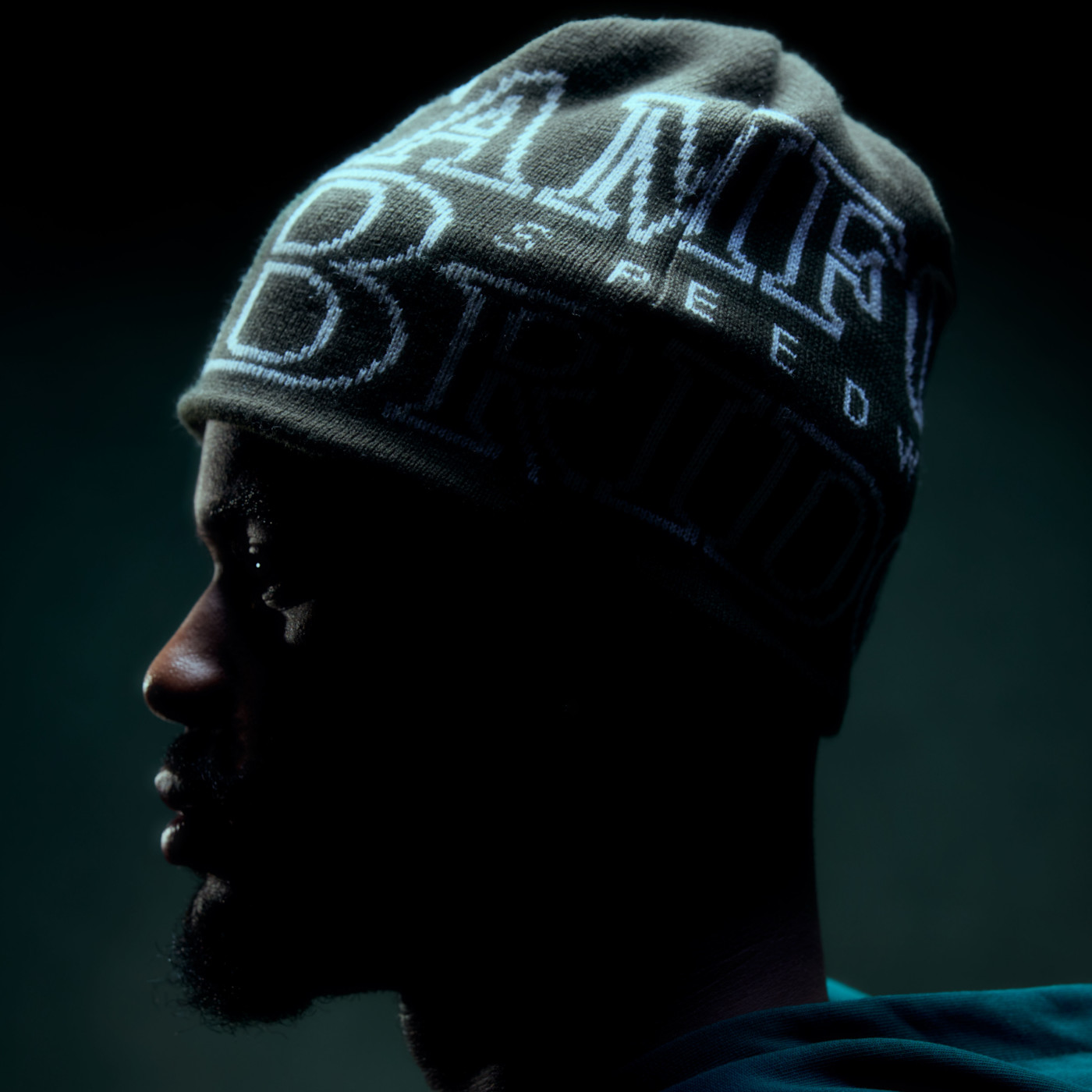The reversible bomber jacket appears in cream on one side with stitched quilting and a large number 42 on the back, referencing Gus Kuhn who captained the Stamford Bridge speedway team. The reverse shows a full racing green outer with club wording on the chest. A green beanie, a scarf and several cap styles complete the range, each carrying early speedway typography or references to the original trackside signage.