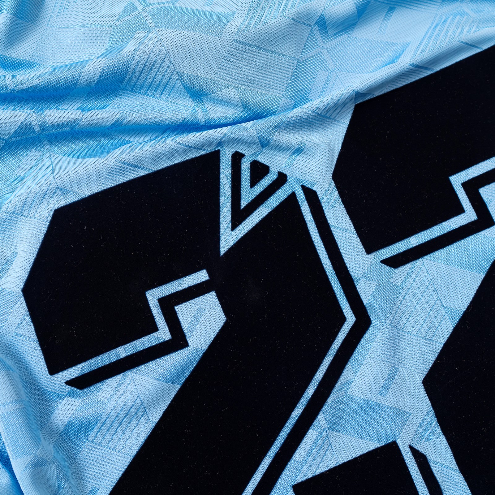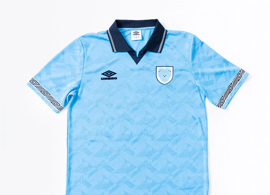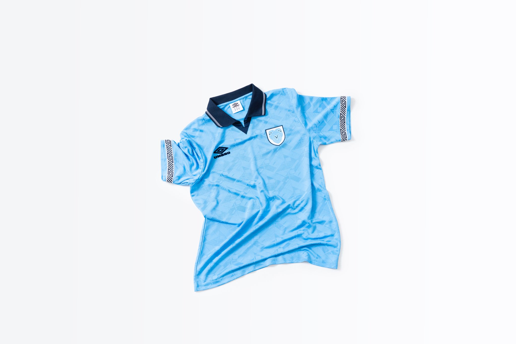 The shirt, actually based on the Third release for the Italia ’90 World Cup (worn by New Order’s Bernard Sumner in the famous World in Motion music video), is in sky blue with a retro jacquard pattern and twist on the famous Three Lions crest.