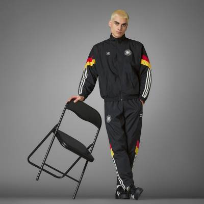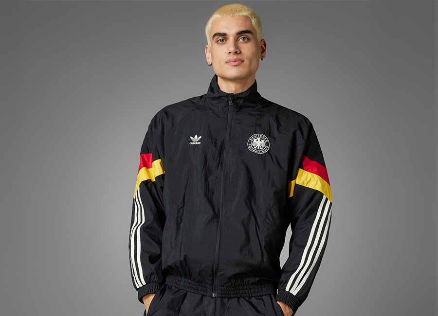 The retro item from “the brand with the three stripes” has its famous insignia in white with the “Schwarz-Rot-Gold” flag colours featuring in the black (on black), red and yellow/gold on the sleeves.