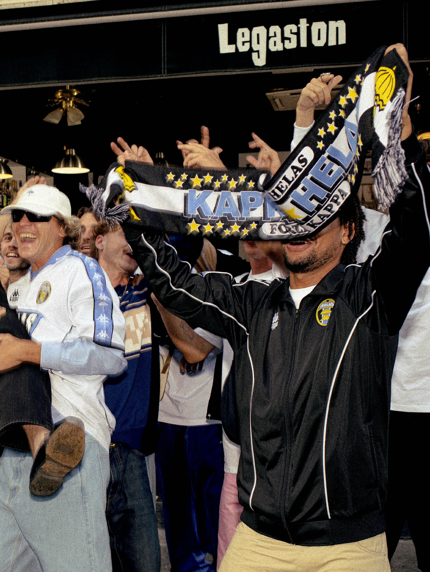 Accessories round out the release with a black cap embroidered with the collaborative badge and a black scarf with white and blue stripes, decorated with yellow umbrellas and the slogan “Forza Hélas Forza Kappa.”