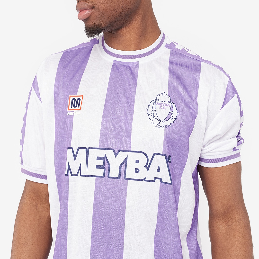 The Meyba Vala Jersey in White and Purple features shiny printed details showing off the brand with Barcelona roots and years of heritage.