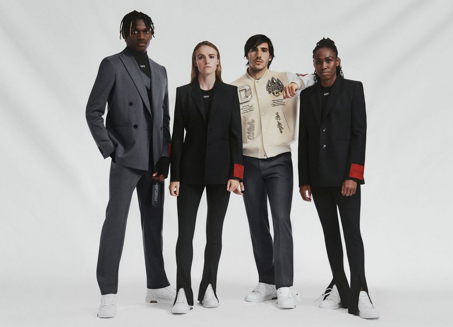 The formal uniform debuts a double-breasted jacket that appears classic from the front, while the back reveals two sporty vertical tonal stripes and a player's uniform number. Matching suit-style pants introduce split cuffs and a statement tag on the left leg that, with trademark Off-White™ satire, defines the garment with a "Uniform" quote.