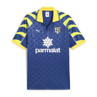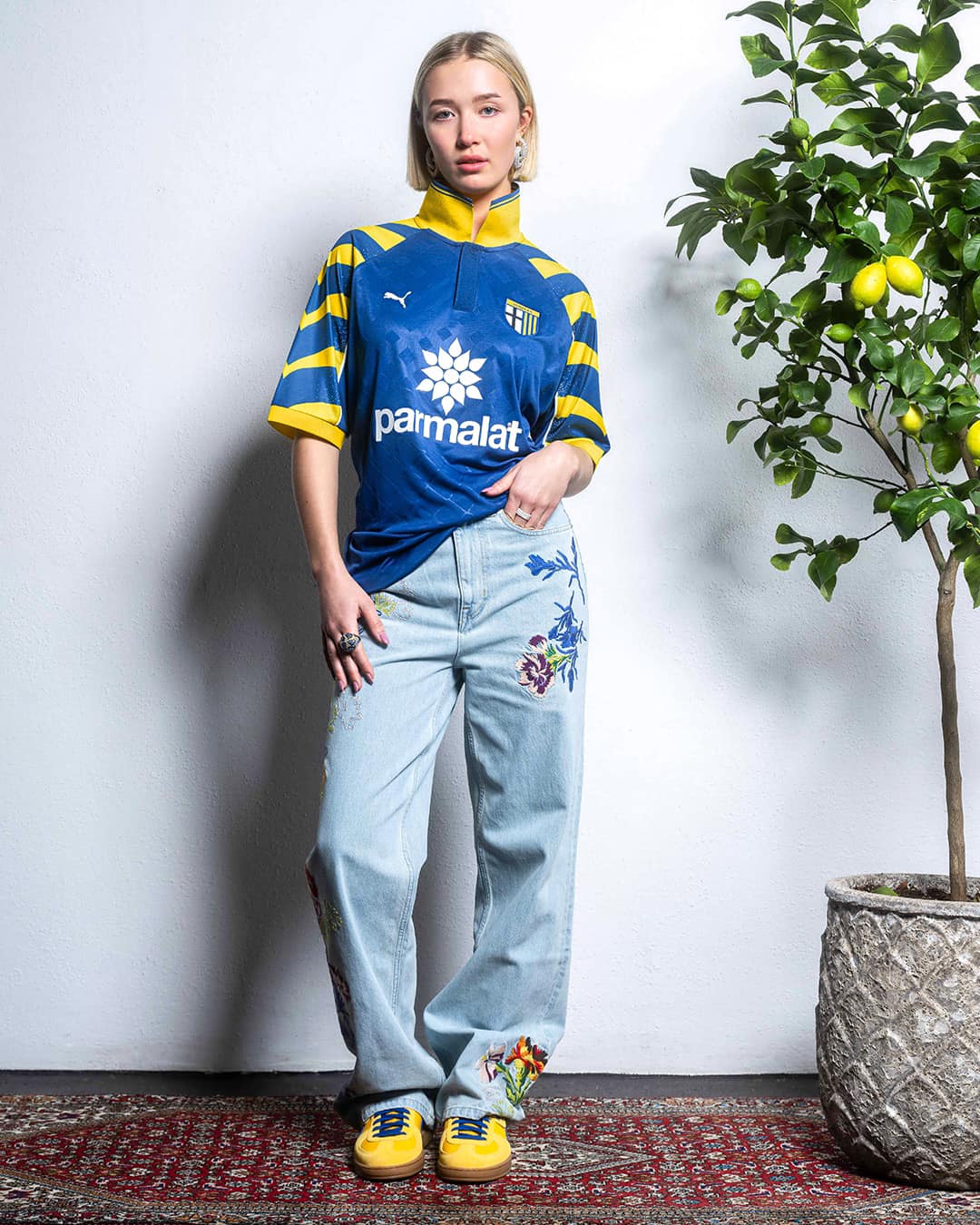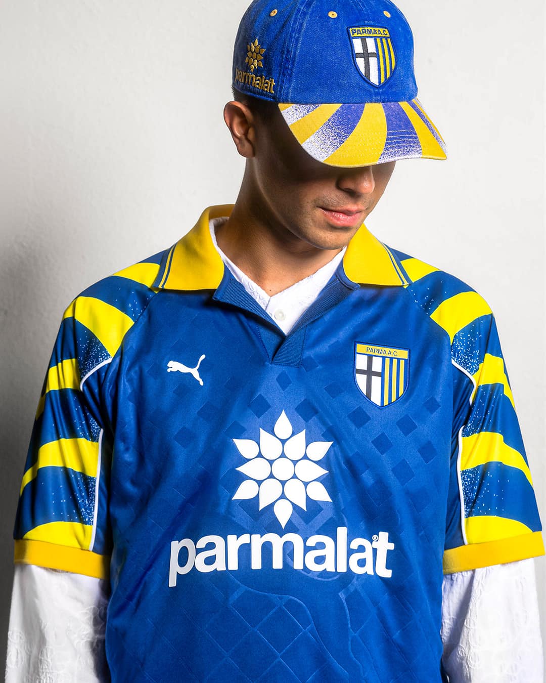That “Parmalat”-sponsor-carrying evocative item - bringing to mind the likes of club legends Fabio Cannavaro and Hristo Stoickov - is joined by a Parma-ified pair of trainers/”sneakers” and a denim-styled six-panel cap, both delivering additional 1990s vibes.