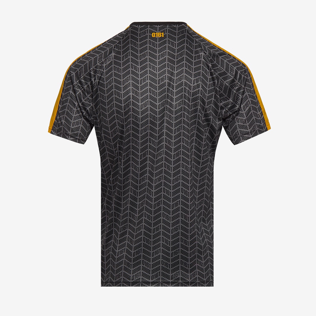The Puma MCR City Pack II Jersey has a bold all-over Manchester area dialling code pattern with black trim around the upper chest area, and dynamic yellow panels over the shoulders and down the sleeves.