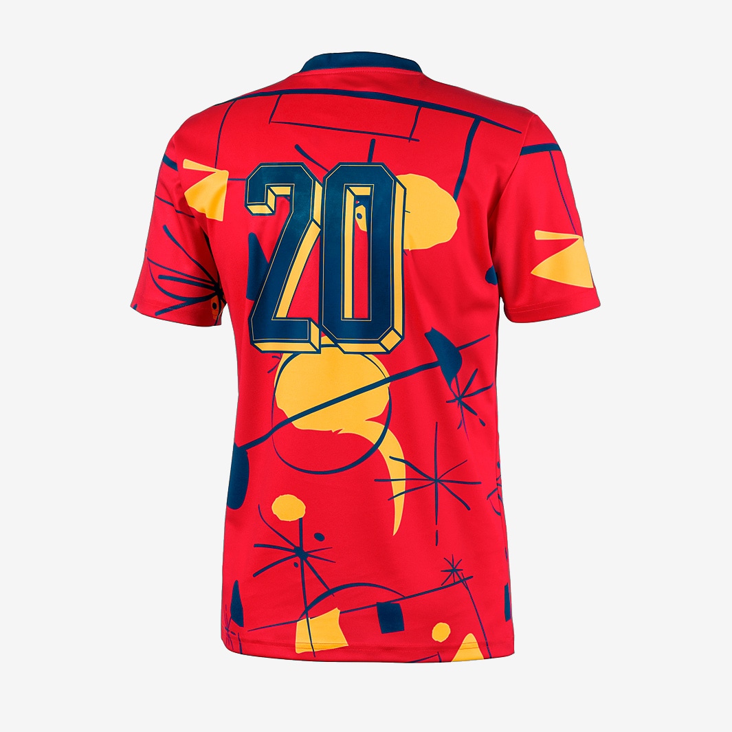 This La Roja top has been designed by Quatre Cent Quinze, a French street-wear brand, resulting in a bold and striking design, which includes an abstract image of a football pitch.