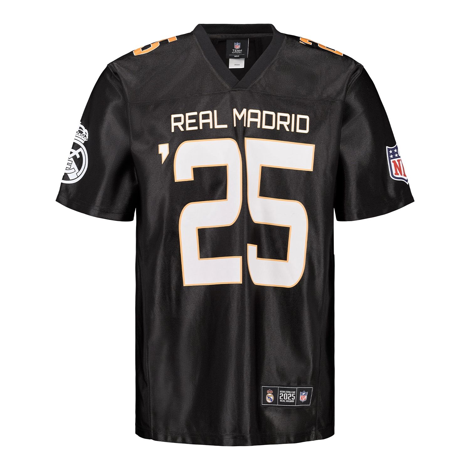 The collection features American football inspired shirts in black and white, each carrying the Real Madrid name and the number twenty five on the front and back. These items use the cut and numbering style associated with United States gridiron jerseys, giving the pieces a link to the NFL influence.