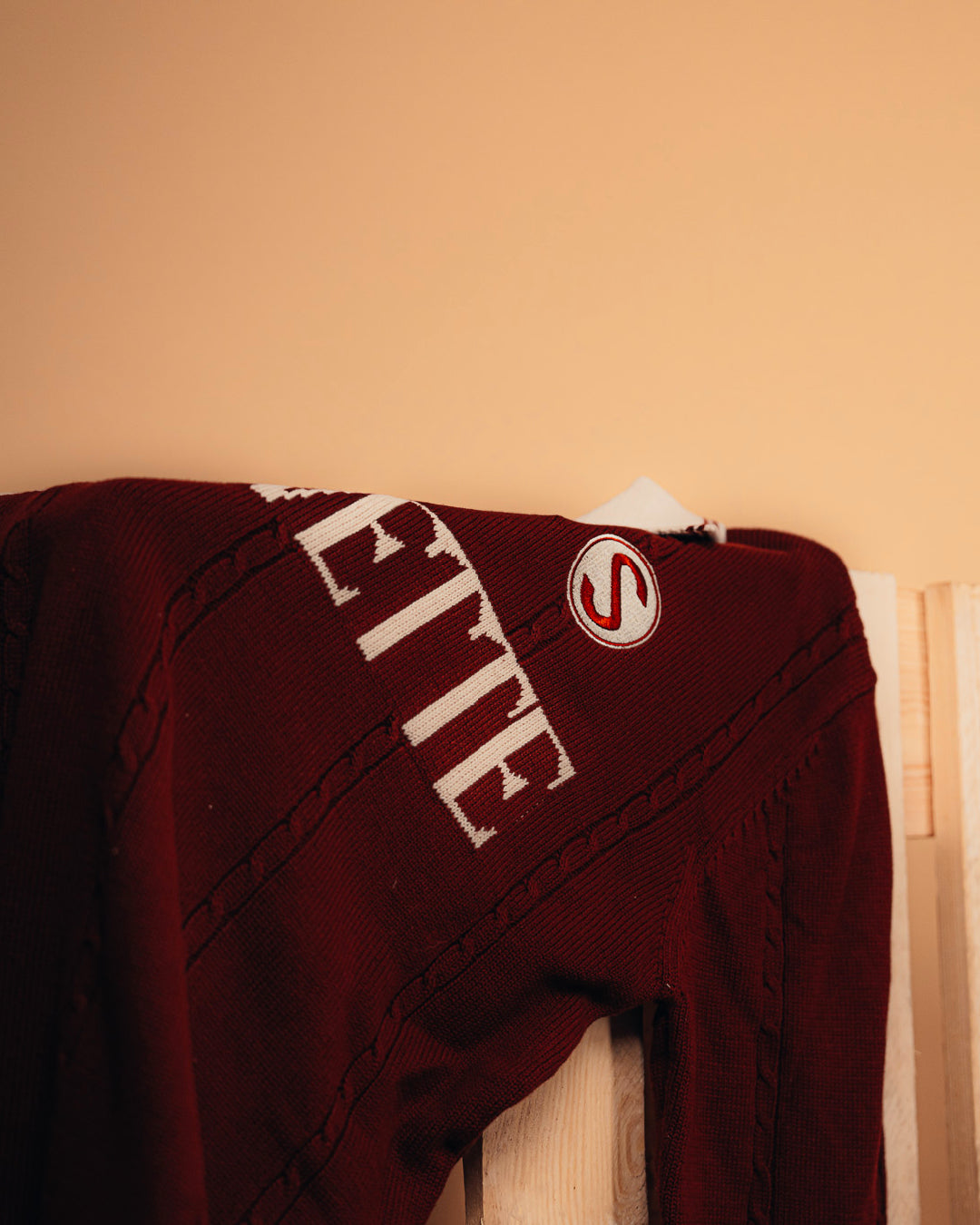 The Knit Sweater SFC appears in a deep burgundy tone, featuring a ribbed knit structure with vertical detailing running through the body and sleeves. A contrasting white collar and cuff finish is paired with subtle stripe accents. The Servette crest is applied on the chest, alongside a stylised twin-cross motif, while “Servette” is integrated across the front in a knitted graphic.