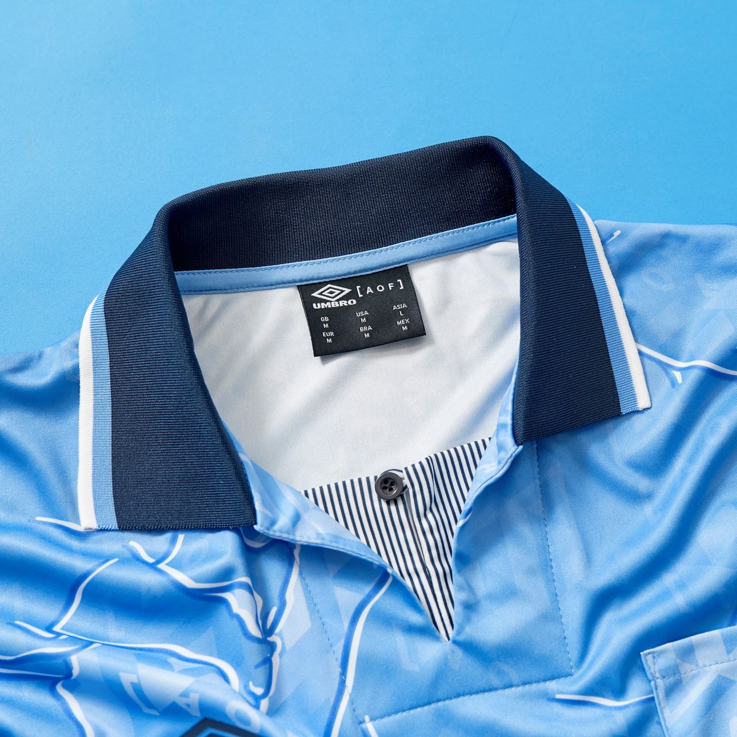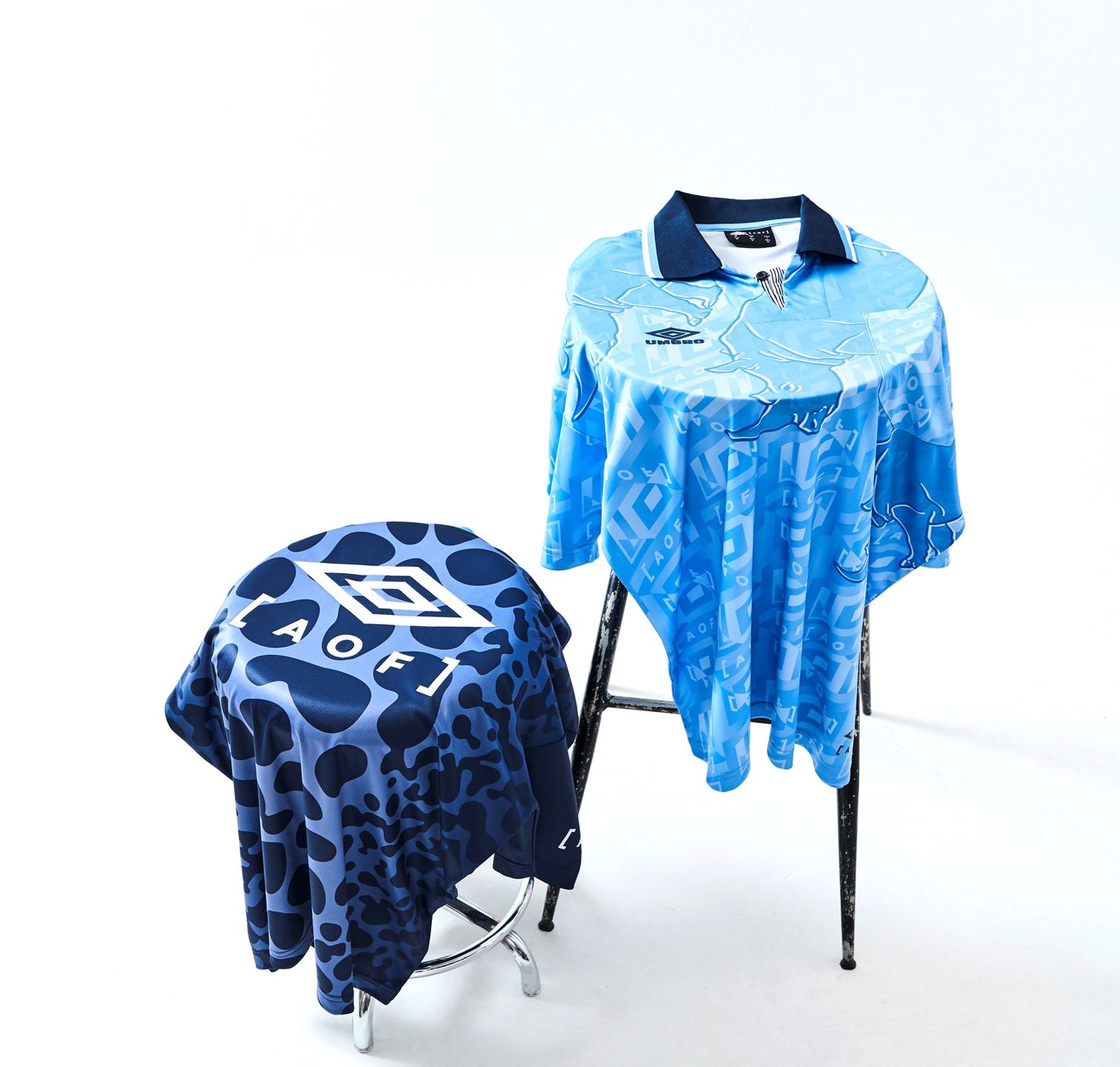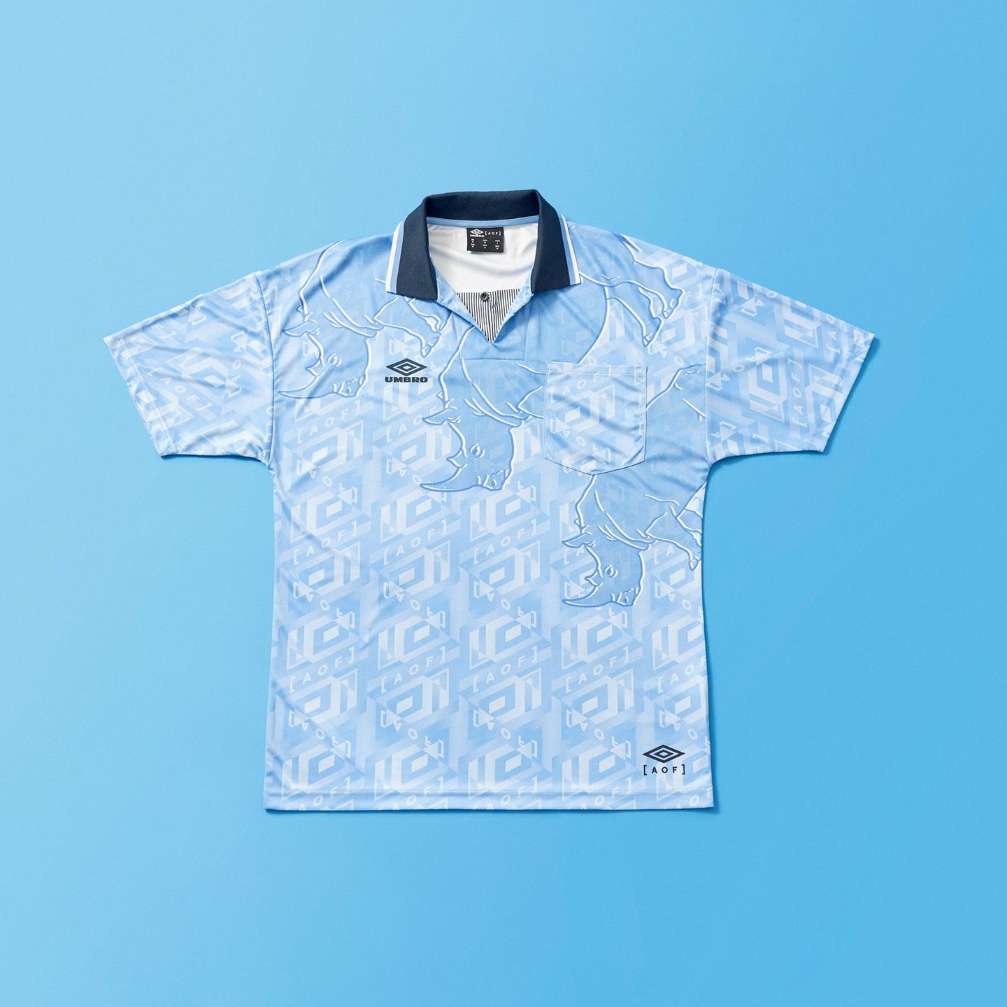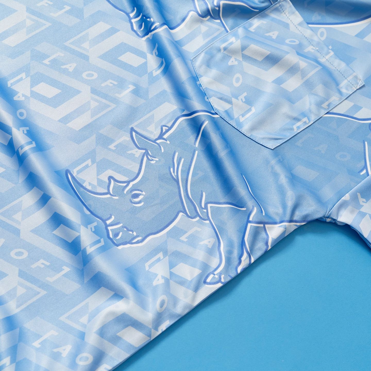 The sky blue “Rhino” jersey features a relaxed silhouette, a rib collar, chest patch pocket and an eye-catching graphic to the front and back of the garment. The print showcases three tonal rhinoceroses on top of a repeat design consisting of the collab partners’ logos.
