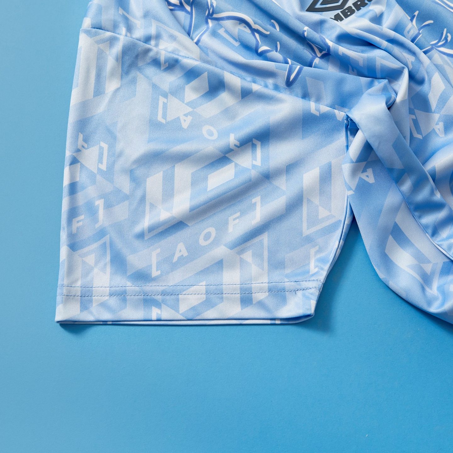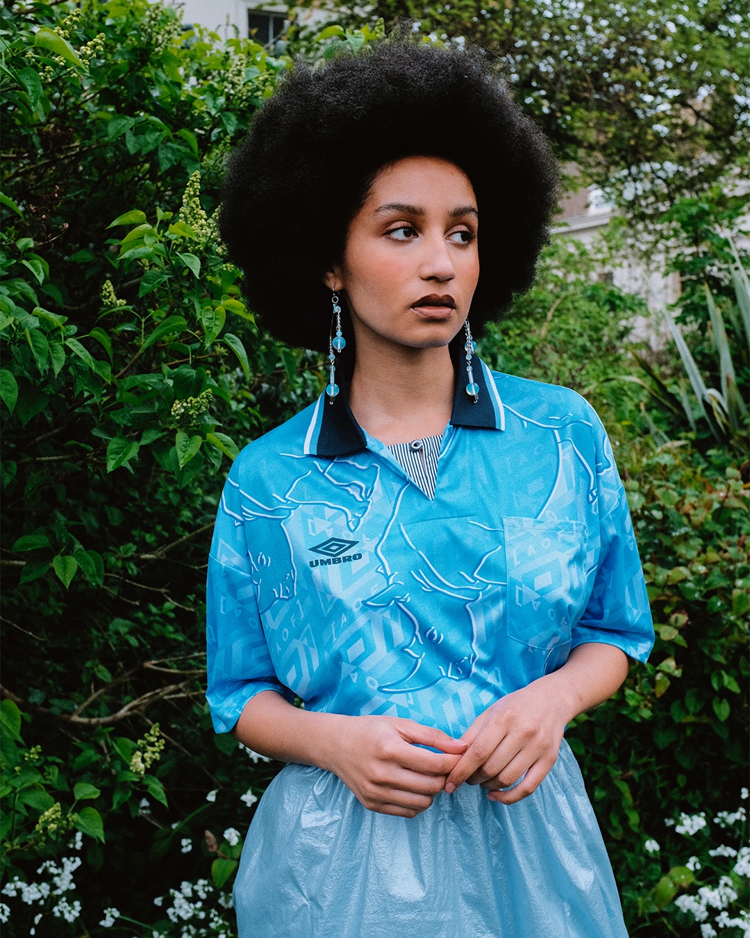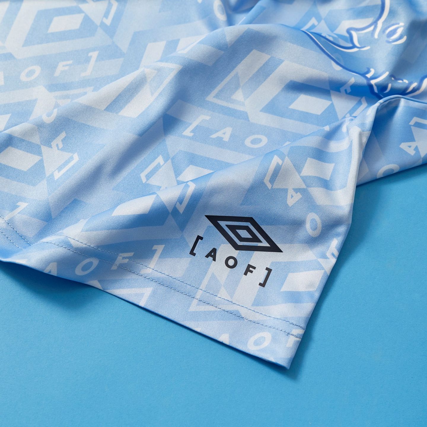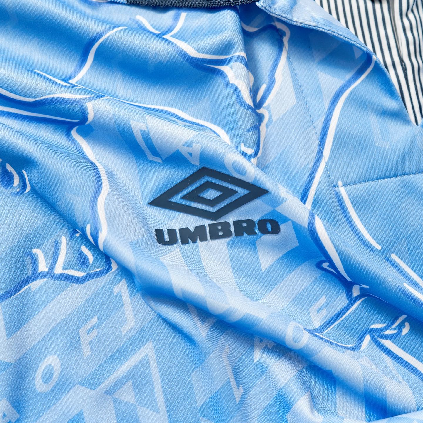 The sky blue “Rhino” jersey features a relaxed silhouette, a rib collar, chest patch pocket and an eye-catching graphic to the front and back of the garment. The print showcases three tonal rhinoceroses on top of a repeat design consisting of the collab partners’ logos.