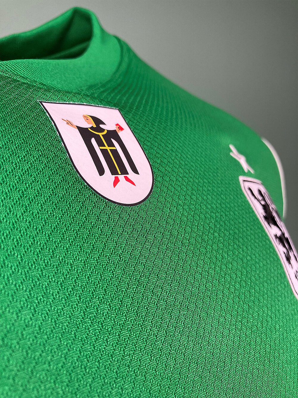The basic template - green trunk with white sleeves - is embellished in form of, beyond the Swoosh, main sponsor print and crest, a “Herz-Brezn” (heart-pretzel) pattern around the said sleeves and, for the first time, the “Münchner Kindl” (Munich Kindl) in the centre of the German side’s chest.