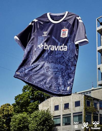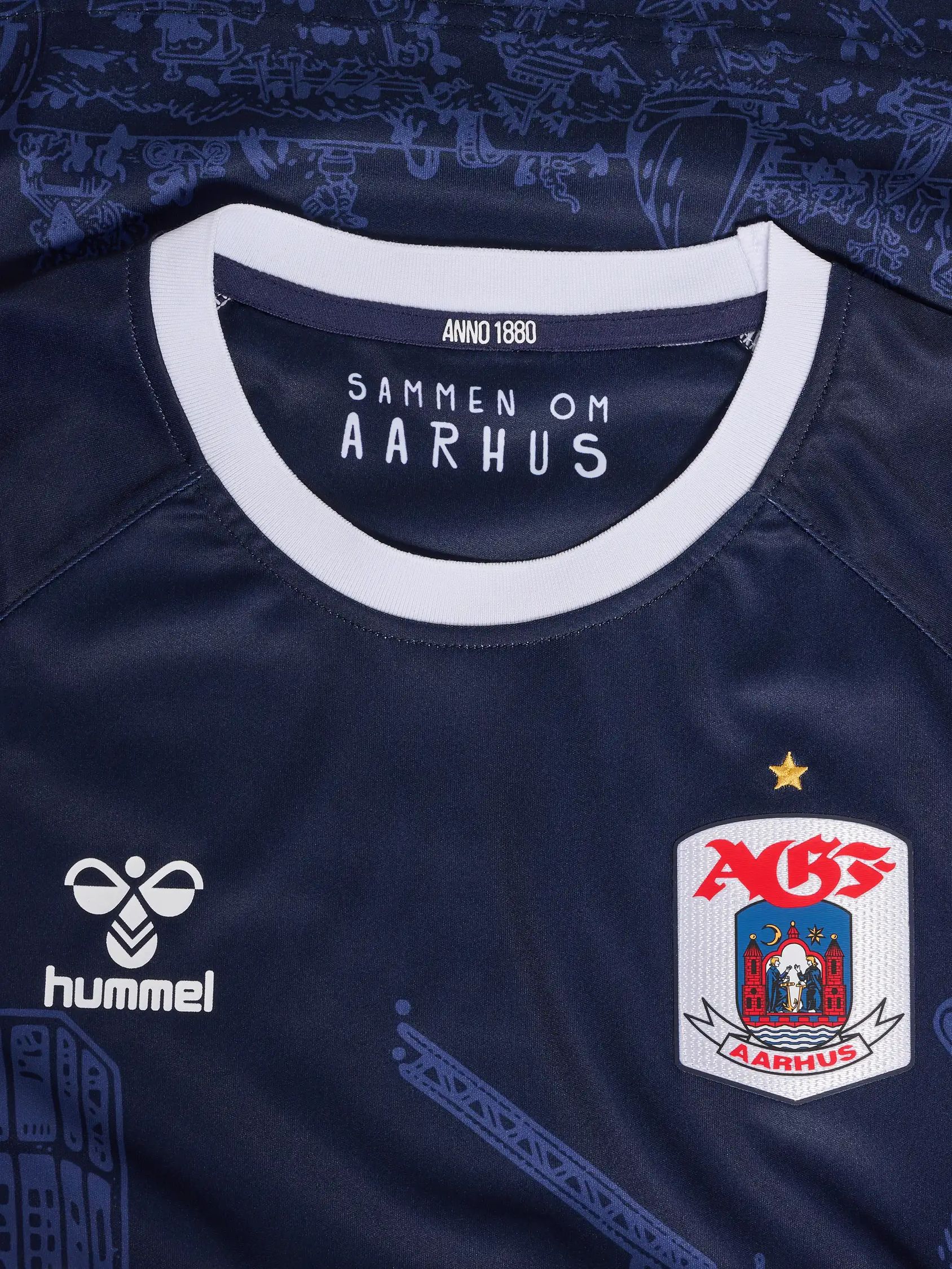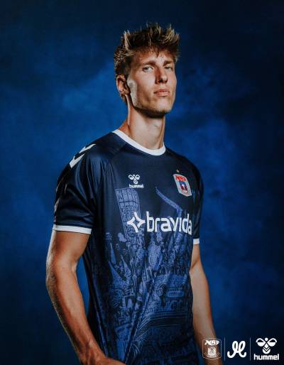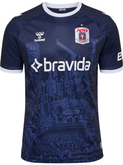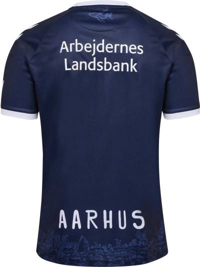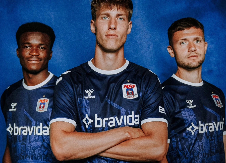 The trunk of the shirt carries part of Mormor’s "Aarhus Bugten" (“Aarhus Bay”) work sublimated and the embellishment beyond this includes contrast white neck and cuffs, white partner branding and a full-colour crest, all on a design that will form a kit with matching shorts - which also include parts of Aarhus Bugten - and complementing socks.