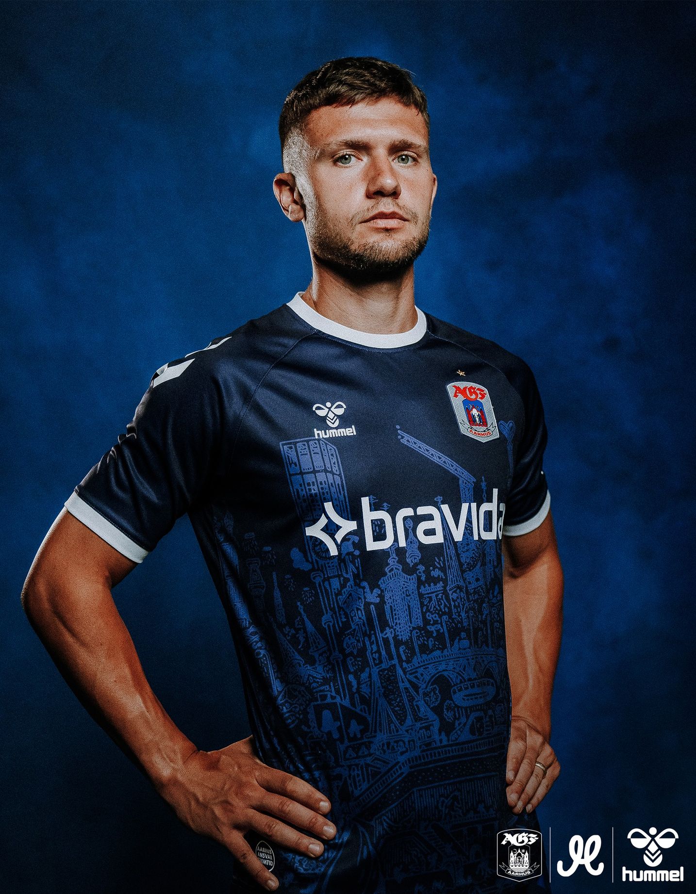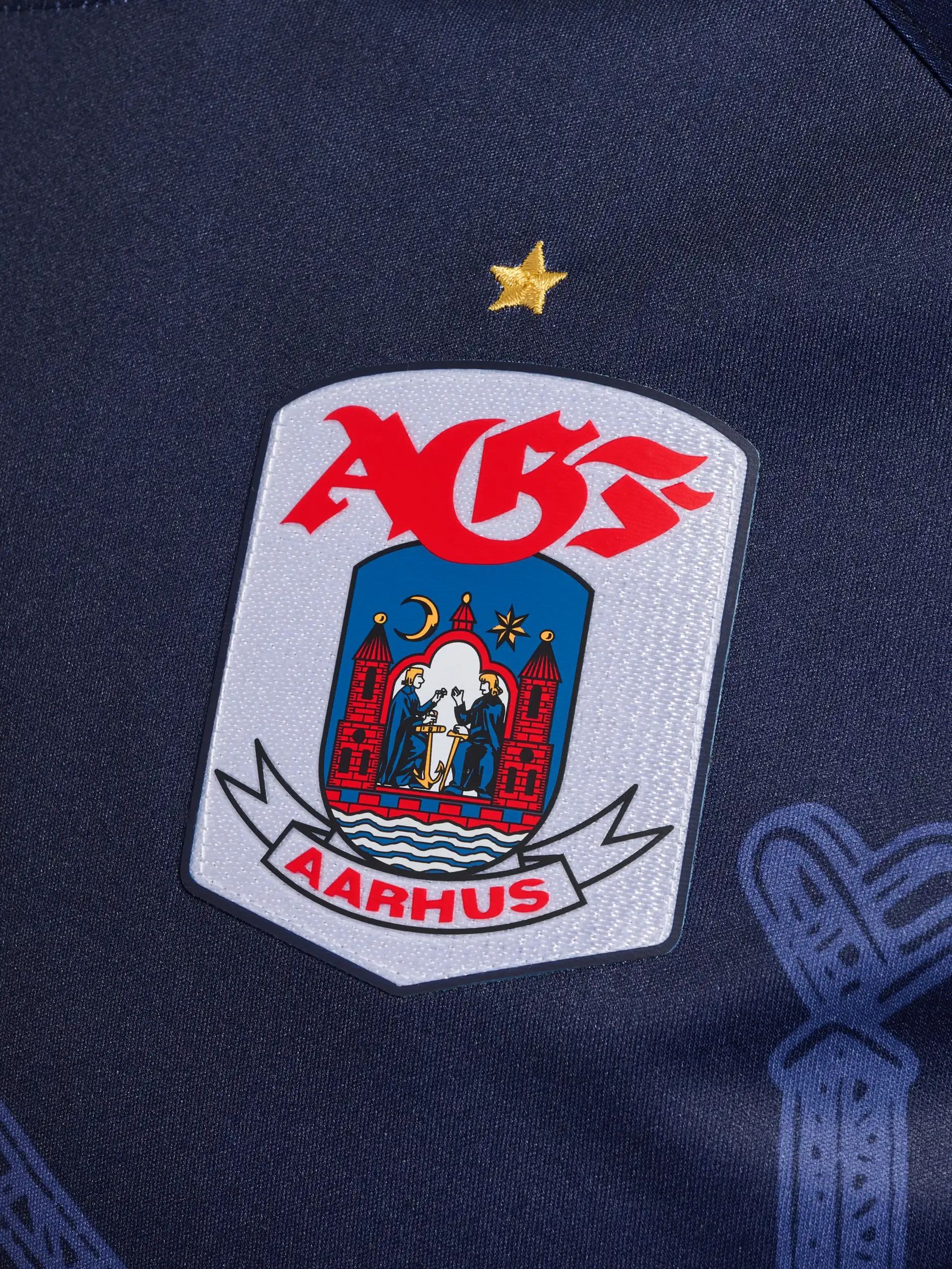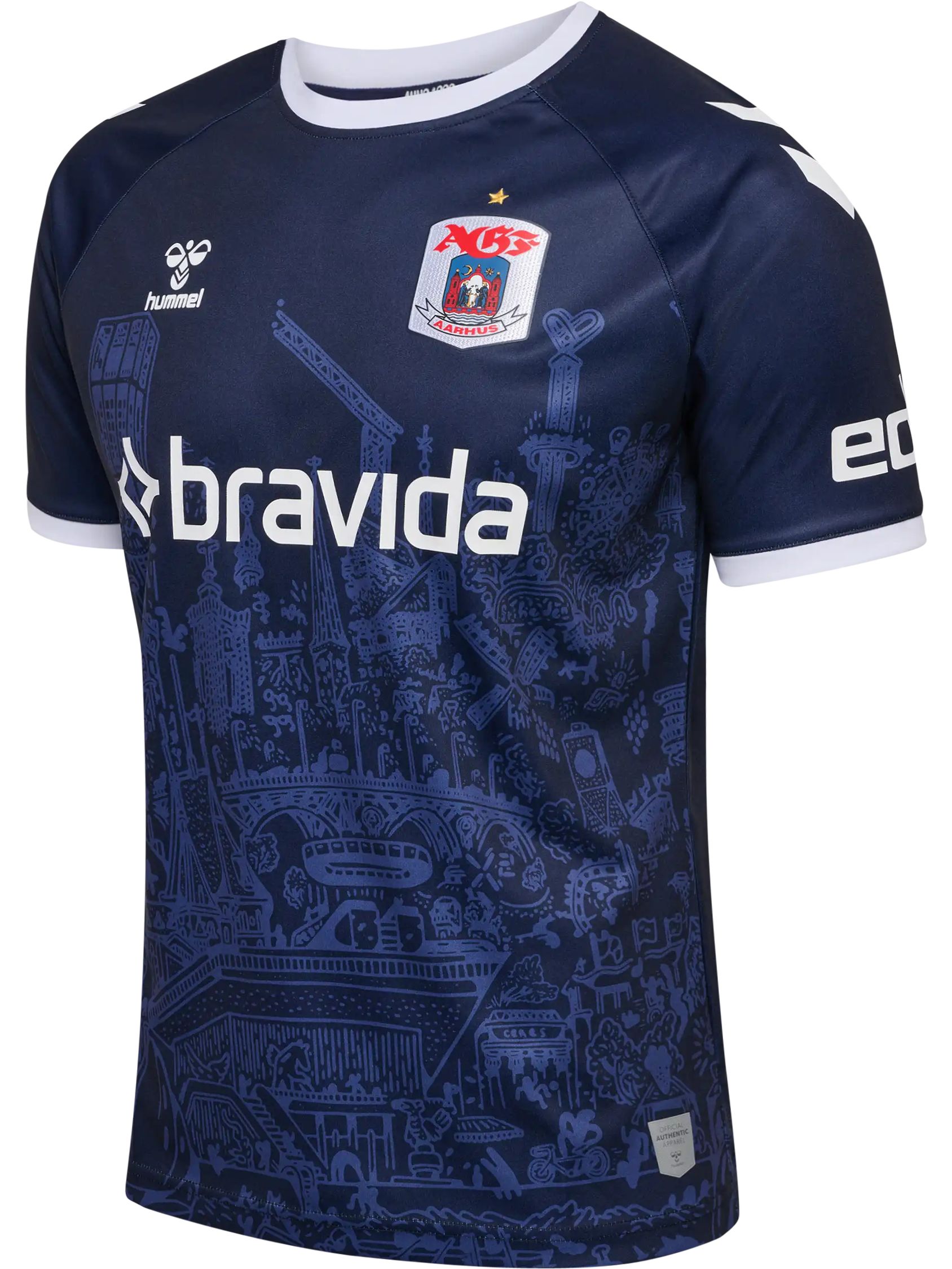 The trunk of the shirt carries part of Mormor’s "Aarhus Bugten" (“Aarhus Bay”) work sublimated and the embellishment beyond this includes contrast white neck and cuffs, white partner branding and a full-colour crest, all on a design that will form a kit with matching shorts - which also include parts of Aarhus Bugten - and complementing socks.