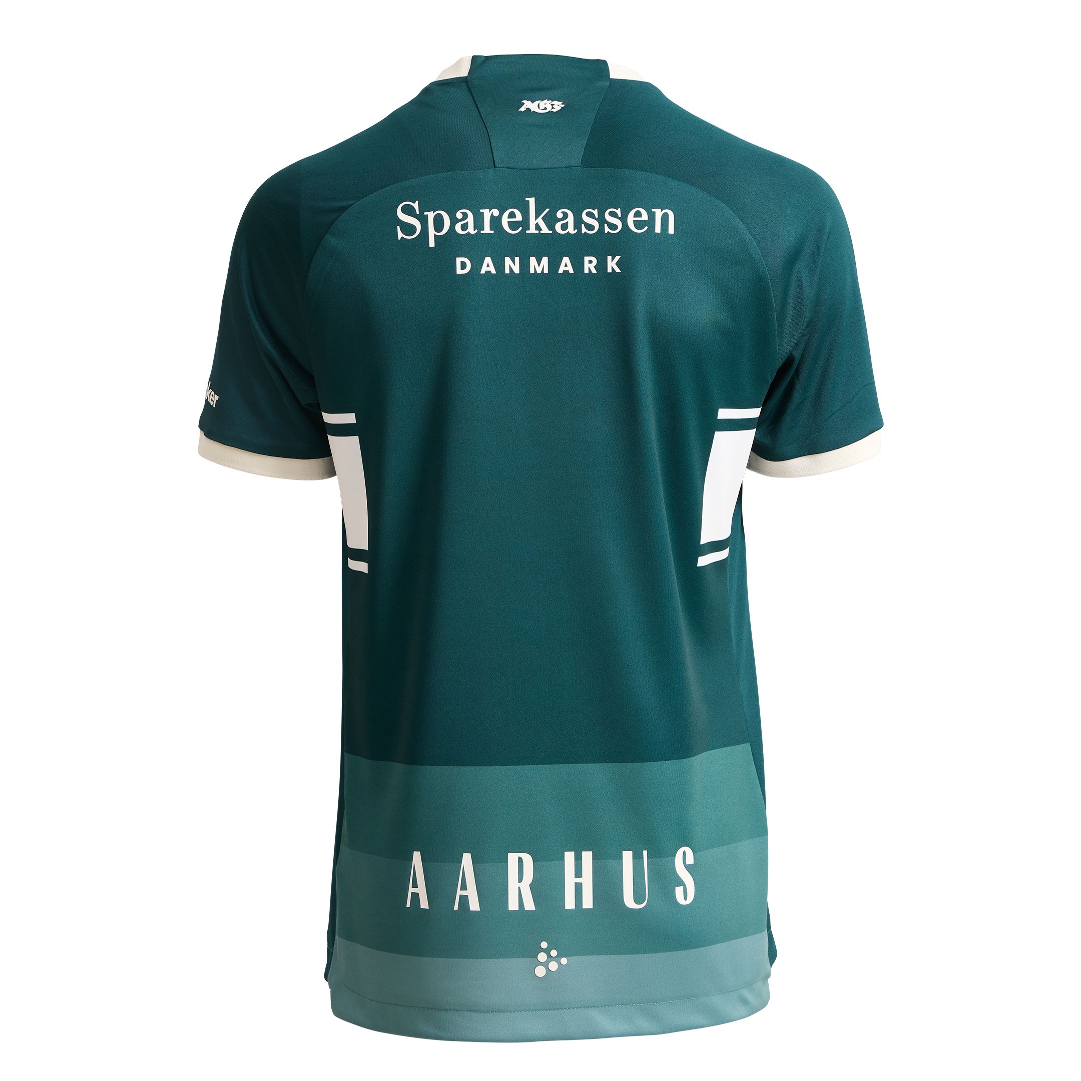 On the back, the word “AARHUS” appears across the lower section, accompanied by the SpareKassen Danmark sponsor logo. The design is rounded off with the AGF initials below the collar, green shorts, and green socks.