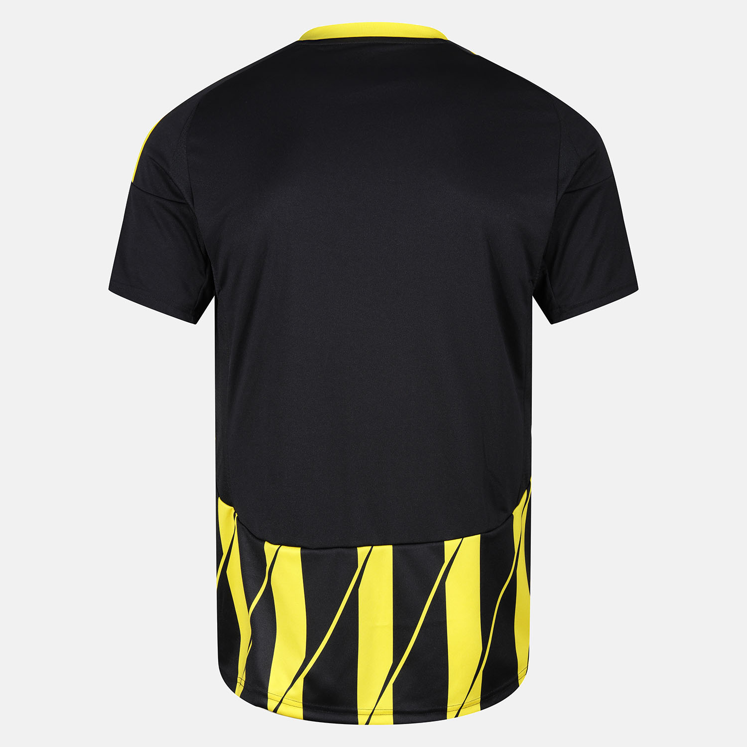 The kit is completed with black shorts and socks, featuring yellow accents.