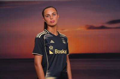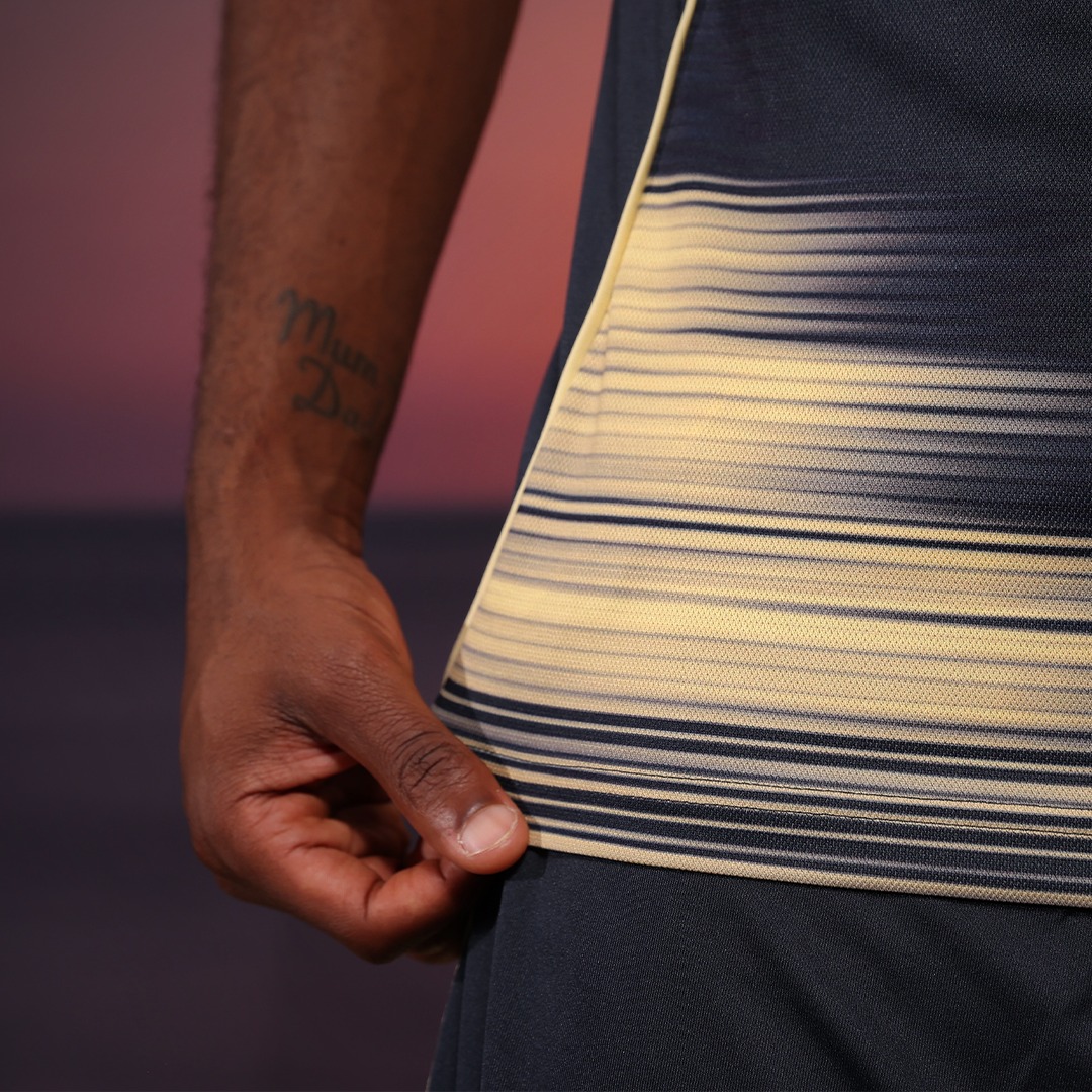 The shirt features a deep navy tone known as North Sea blue, accented with golden sand (pale yellow) elements. A linear pattern runs across the shoulders and lower front, representing the effect of sunlight reflecting on the sea’s surface at sunrise or sunset. Two gold stars above the club crest represent previous European achievements.