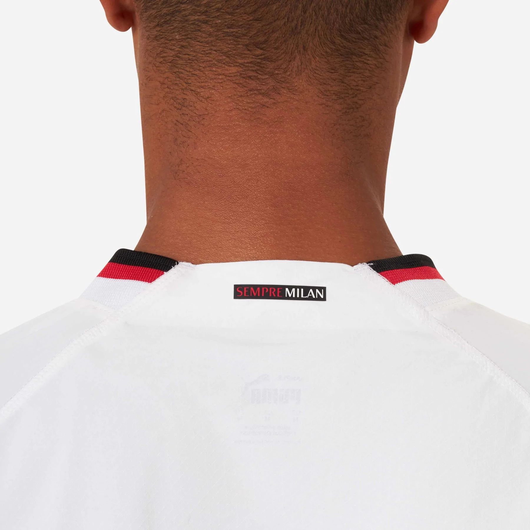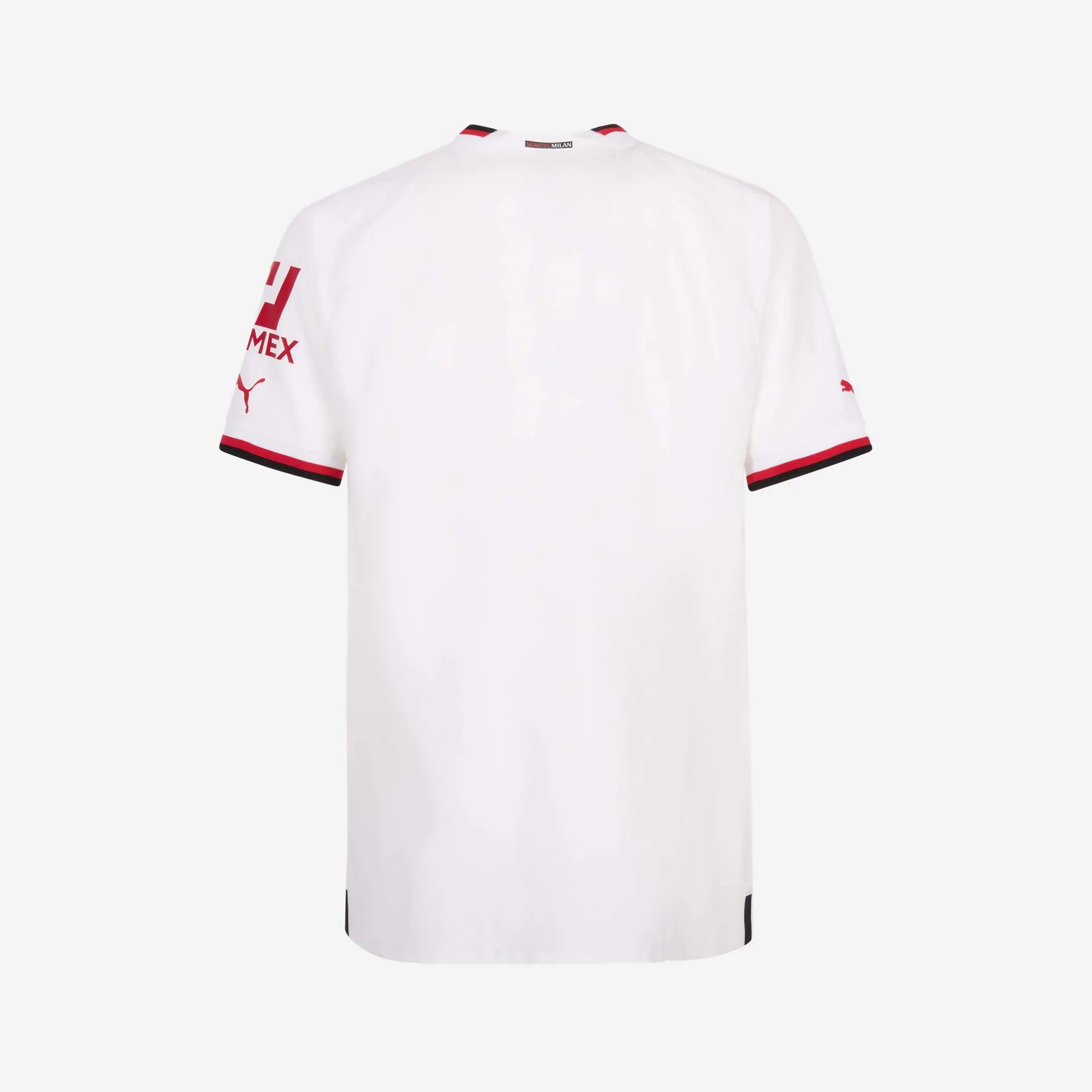 The jersey features black and red trims on the sleeve cuffs and on the V-neck collar, along with the Milan coat of arms on the upper back.