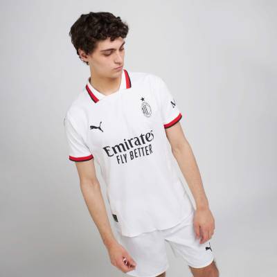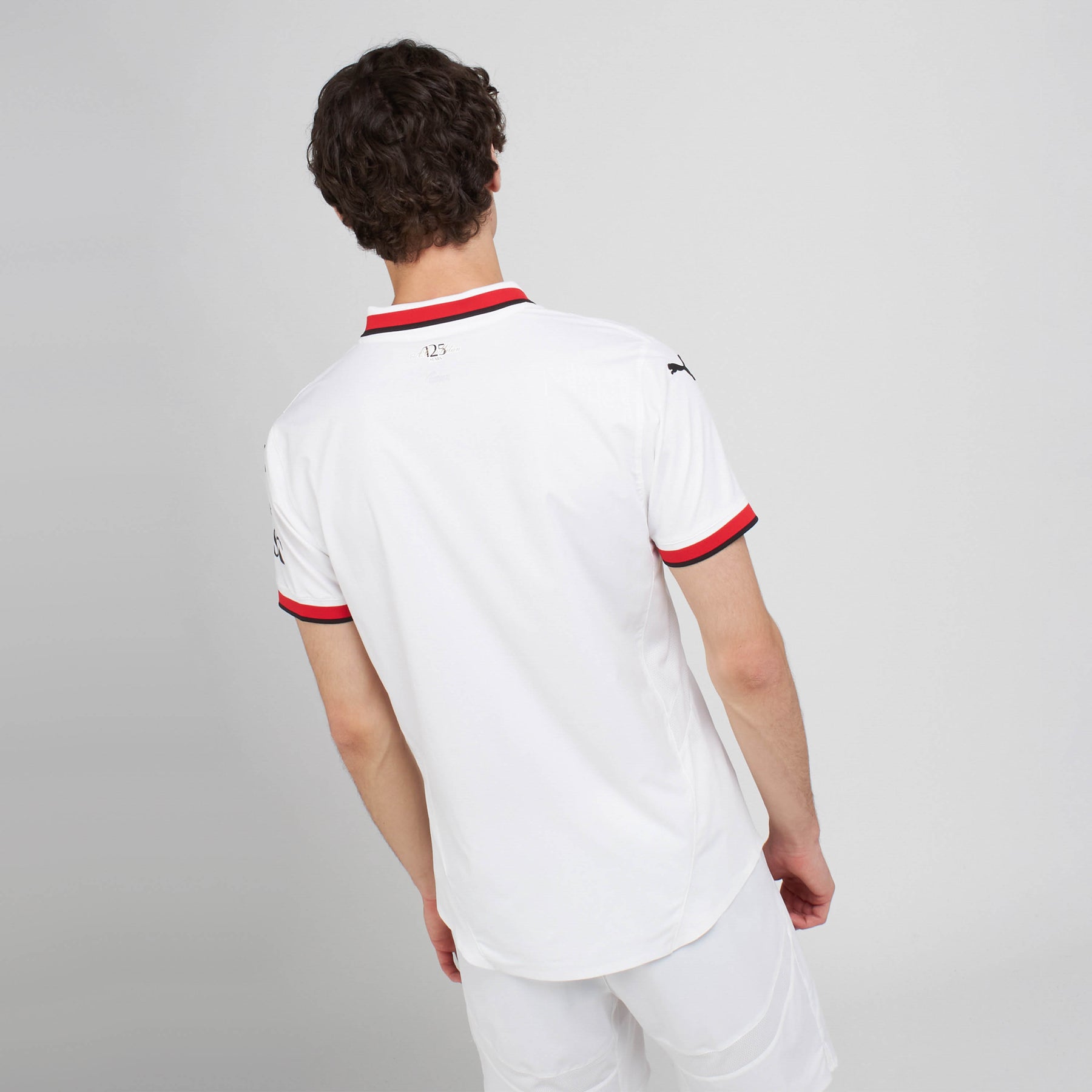 Celebrating the Club's 125-year history, the white away jersey features a red-and-black polo collar and a monochromatic crest. A tonal pinstripe pattern pays homage to AC Milan’s origins as the Milan Football and Cricket Club. The kit is finished with white shorts and white socks with black accents.
