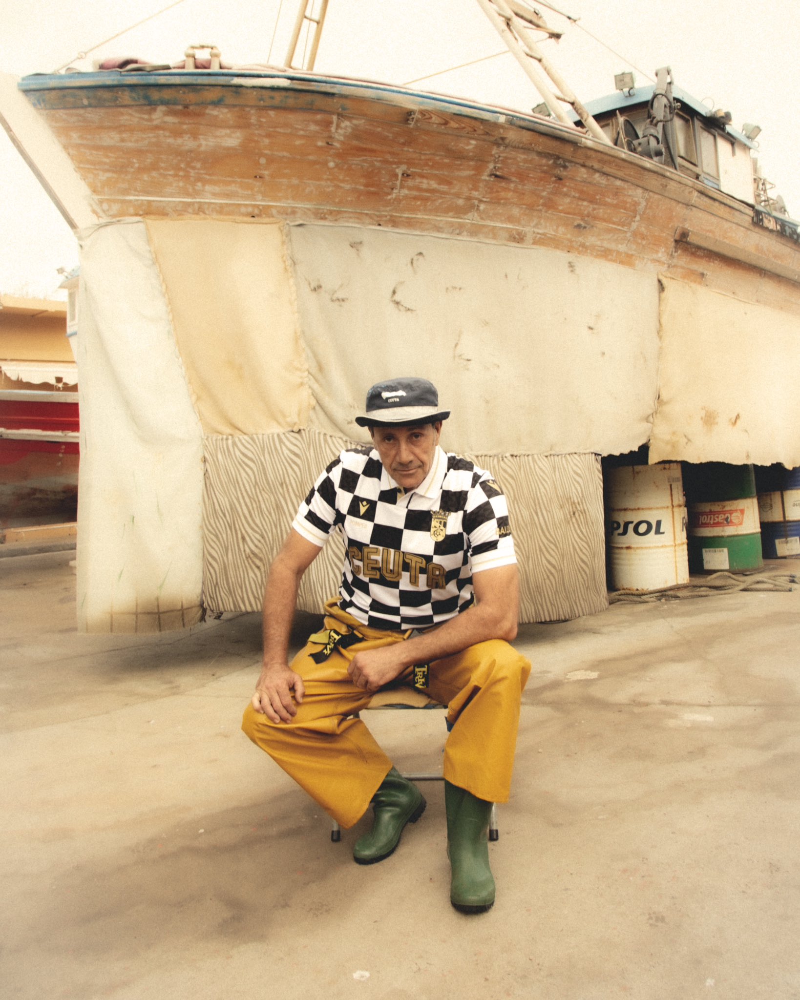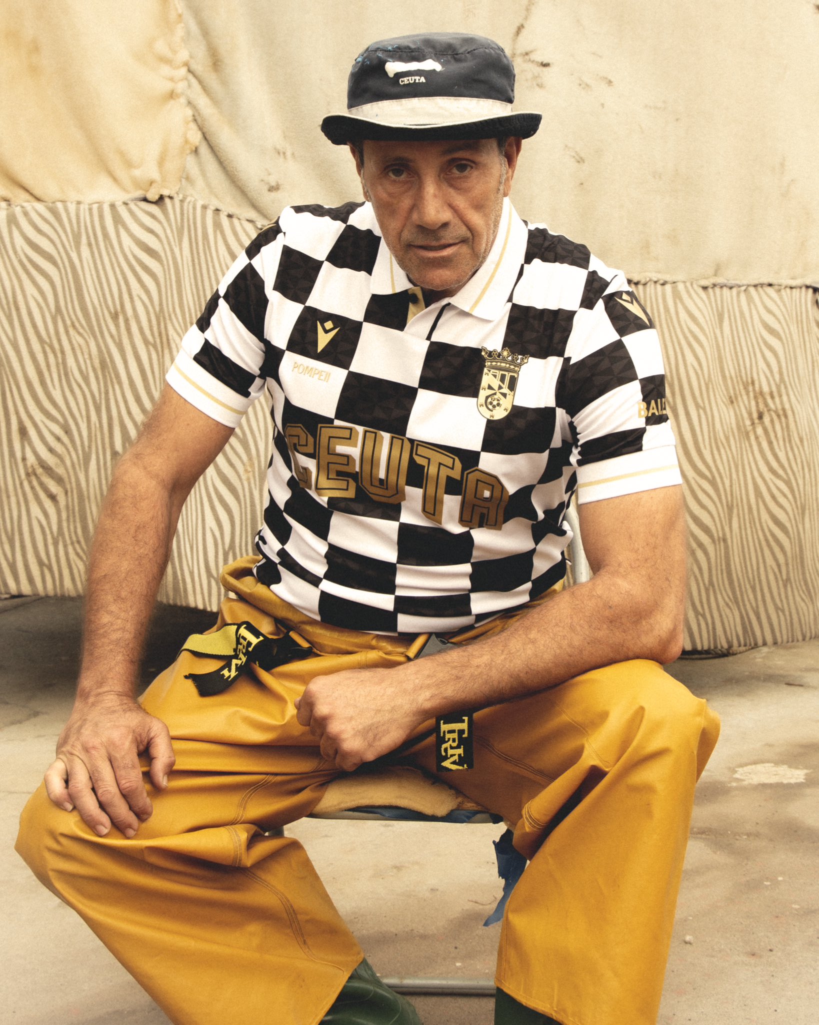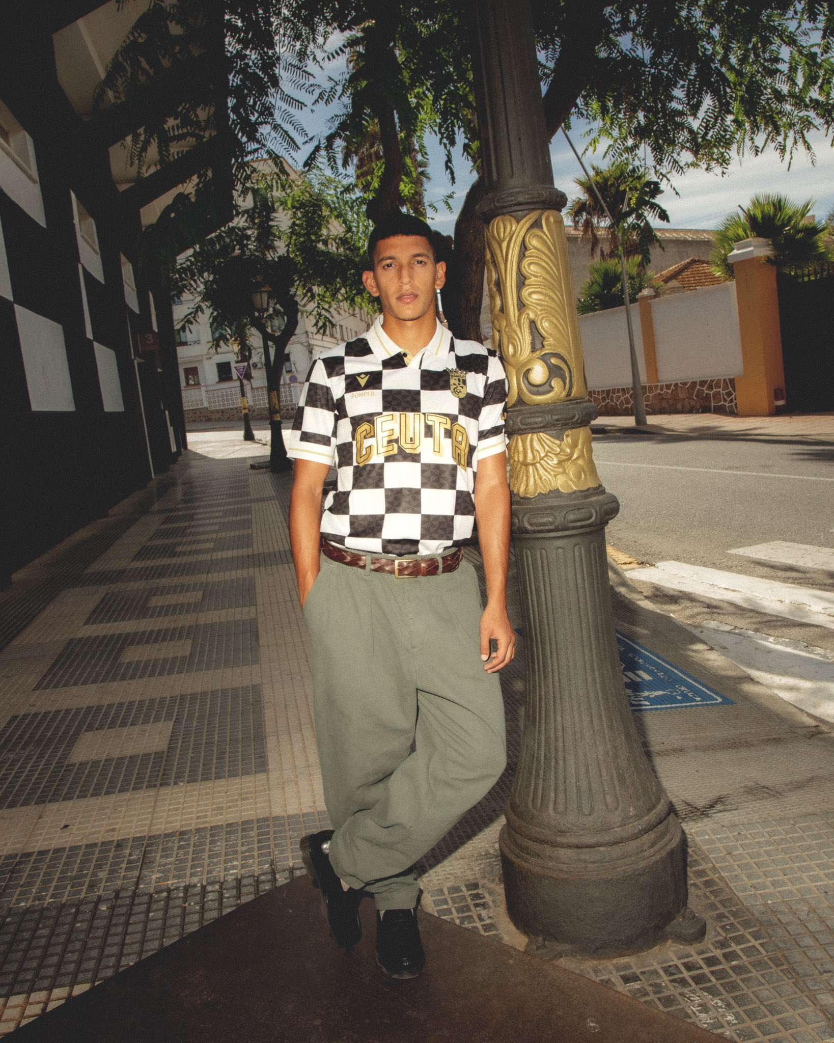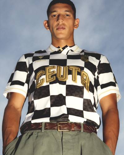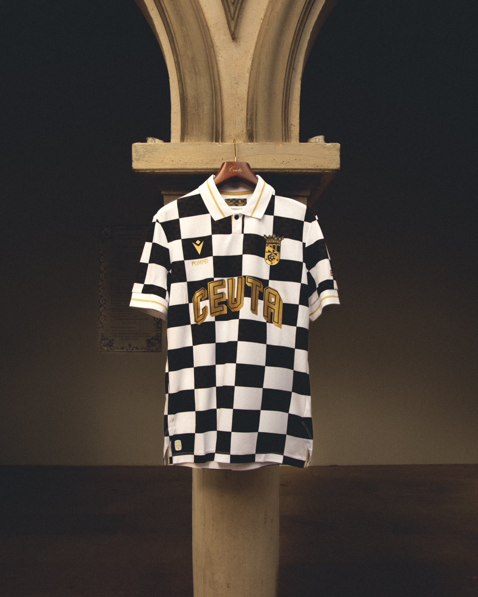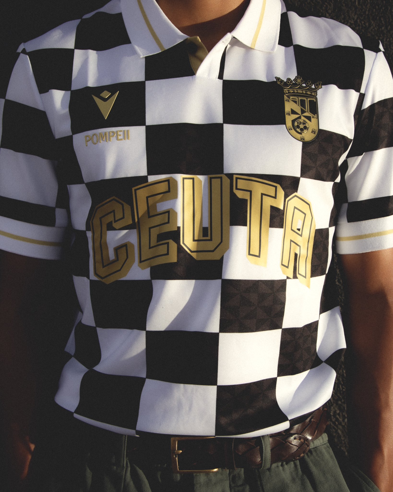 This is the Agrupación Deportiva (AD) Ceuta Fútbol Club (FC) shirt created as part of a collaboration between the Spanish Primera Federación - Group 2 side, supplier Macron and fashion brand Pompeii.