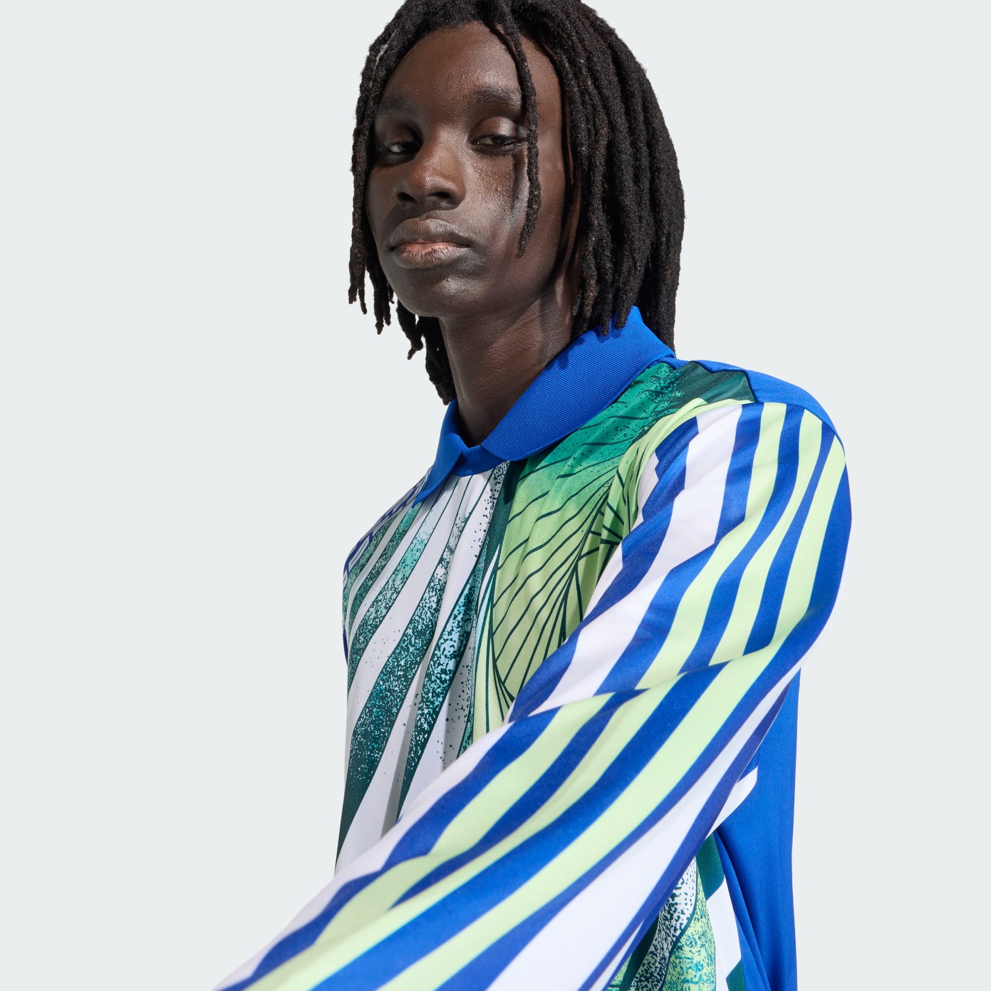 A ribbed fold down collar and ribbed cuffs complete the traditional goalkeeper silhouette, while the loose fit cut mirrors early 90s adidas goalkeeper shirts. The sleeves carry contrasting treatments, with one sleeve incorporating repeating geometric block graphics and the other featuring vertical stripe detailing in blue, white and light green tones.